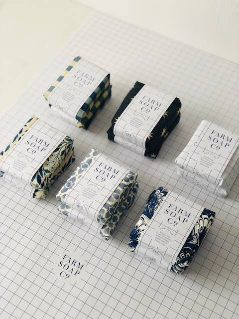 Farm Soap Co. soaps are gentle, vegan, natural and made from botanical ingredients. Fragrances are delicate and contain no synthetic chemical fragrances. These soaps are suitable for washing both skin and hair, and because they contain natural oils and butters, they are moisturising and conditioning. Our Hair and Body Slab Soaps are handmade, using traditional cold process soap making techniques, in small batches in our Dorset workshop. There are 14 types of slab soaps available - Lavender, Calendula, Seaweed, Dorset Sea Salt, Bergamot, Peppermint, Pine, Clementine, Rosemary, Grapefruit, Geranium, Italian Olive Oil and Thyme, Pink Himalayan Salt and Rose and Sweet Orange Approximate weight: 110 grams. Packaging: biodegradable wax paper envelope, paper wrapping and paper label.