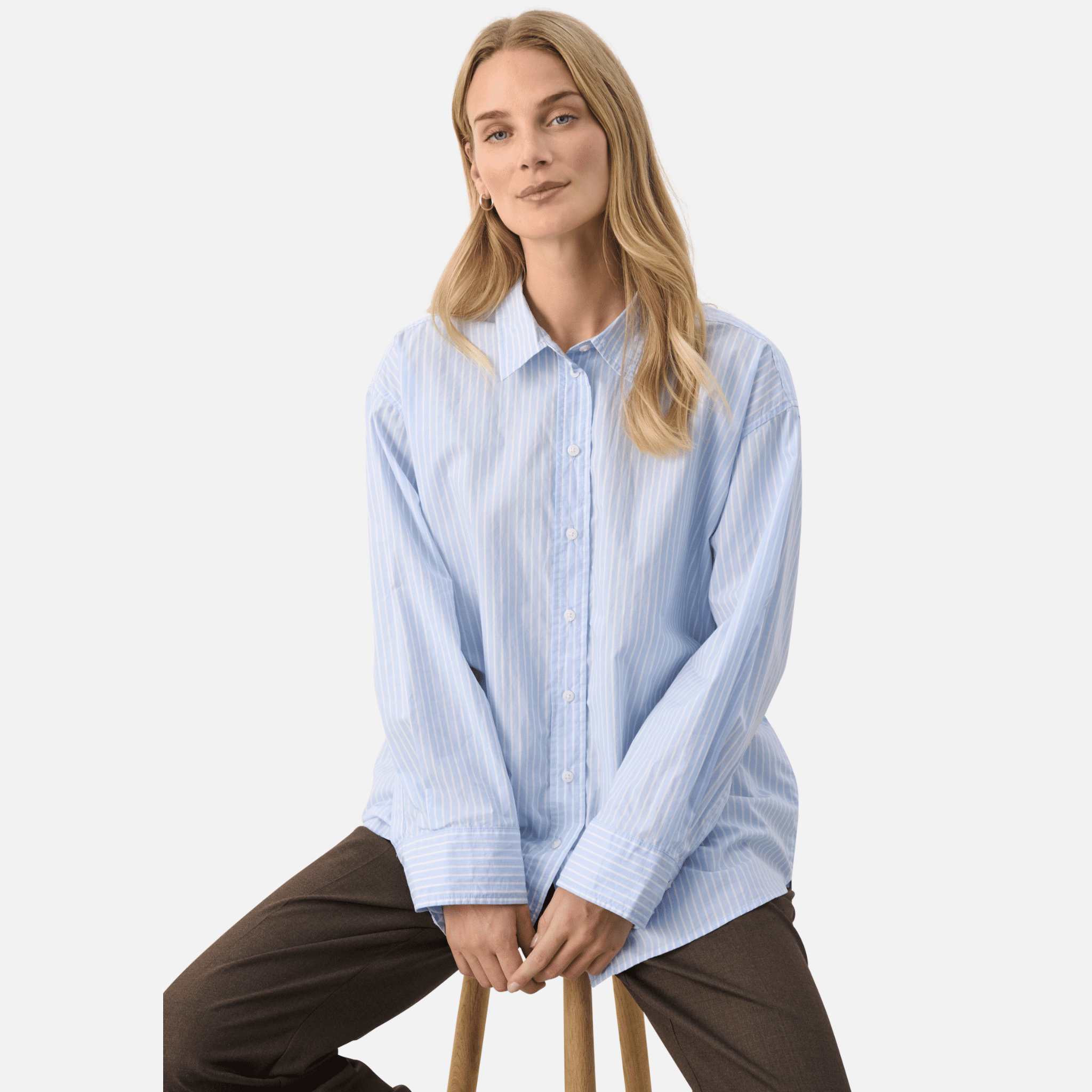 The Savannah Blue Striped Shirt by Part Two is a timeless wardrobe staple, crafted in organic cotton with classic blue stripes. Designed in a relaxed fit with long sleeves, it offers effortless versatility for both casual and smarter styling. Perfect for pairing with tailored trousers, jeans, or skirts, it adds a touch of Scandinavian cool to your everyday looks.