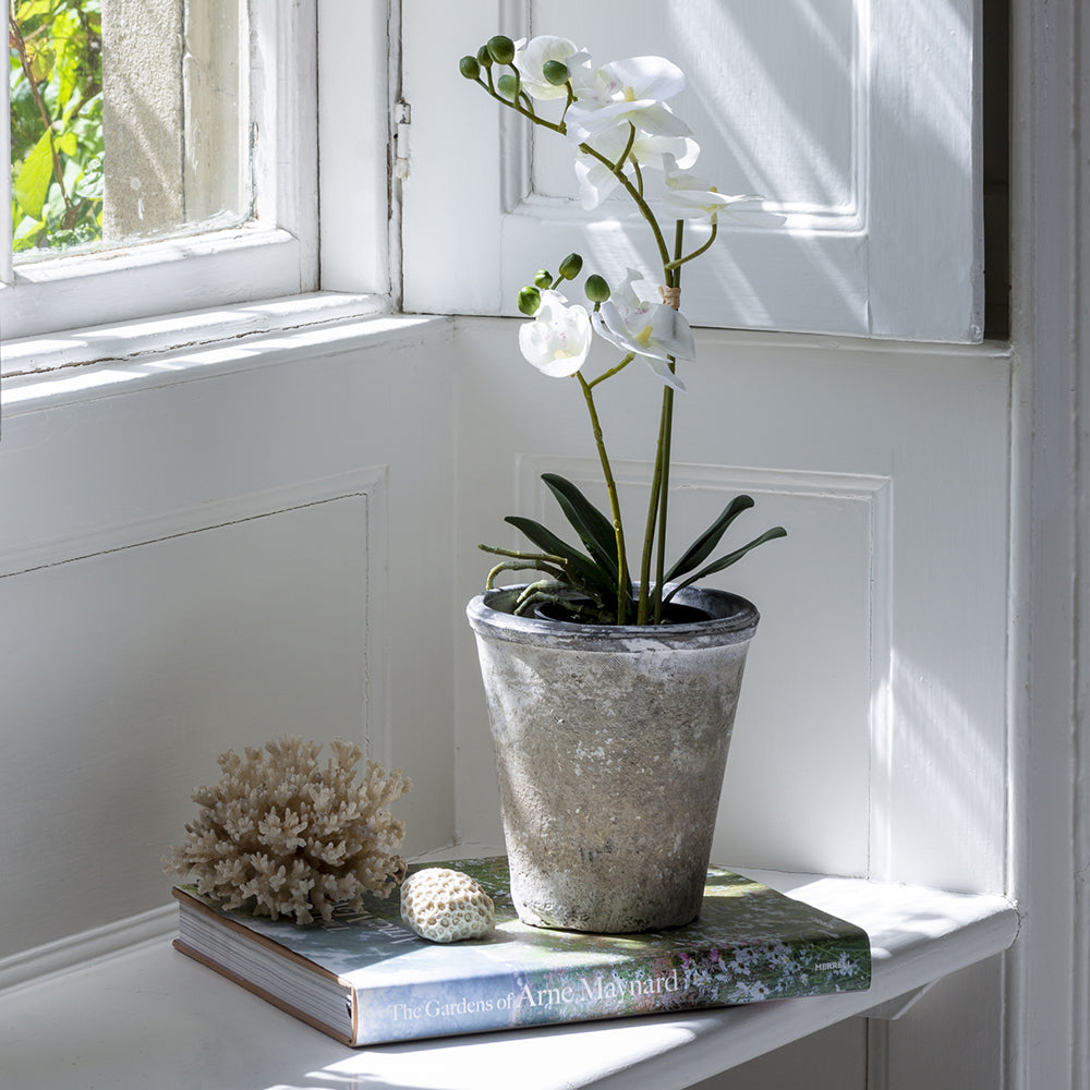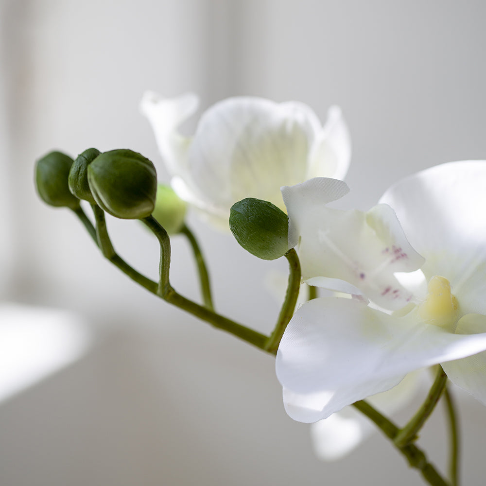 This faux Phalaenopsis or Moth Orchids from Grand Illusions has a round, pure white flower with a hint of blush on the inside of the bloom. This ever popular houseplant looks stunning in the Whitestone Rose pots.