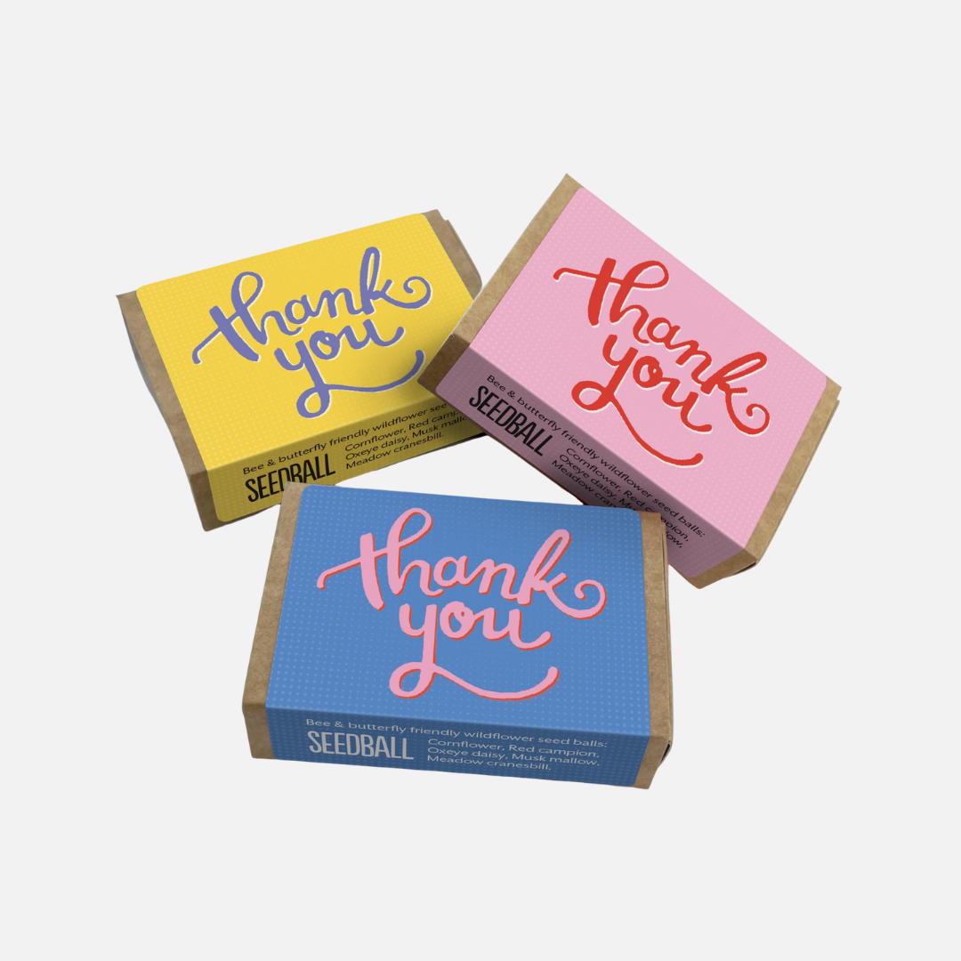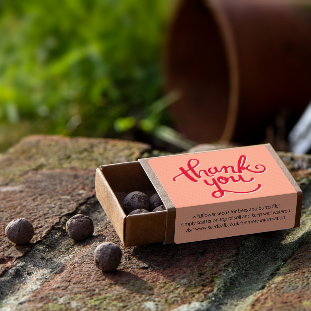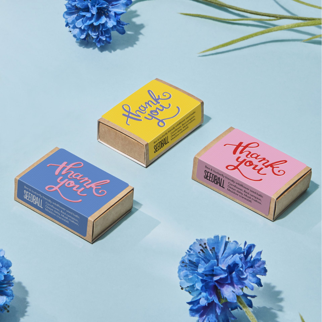 Part of a colourful set of Thank You seed boxes from Seedball packed with bee and butterfly friendly wildflower seeds.