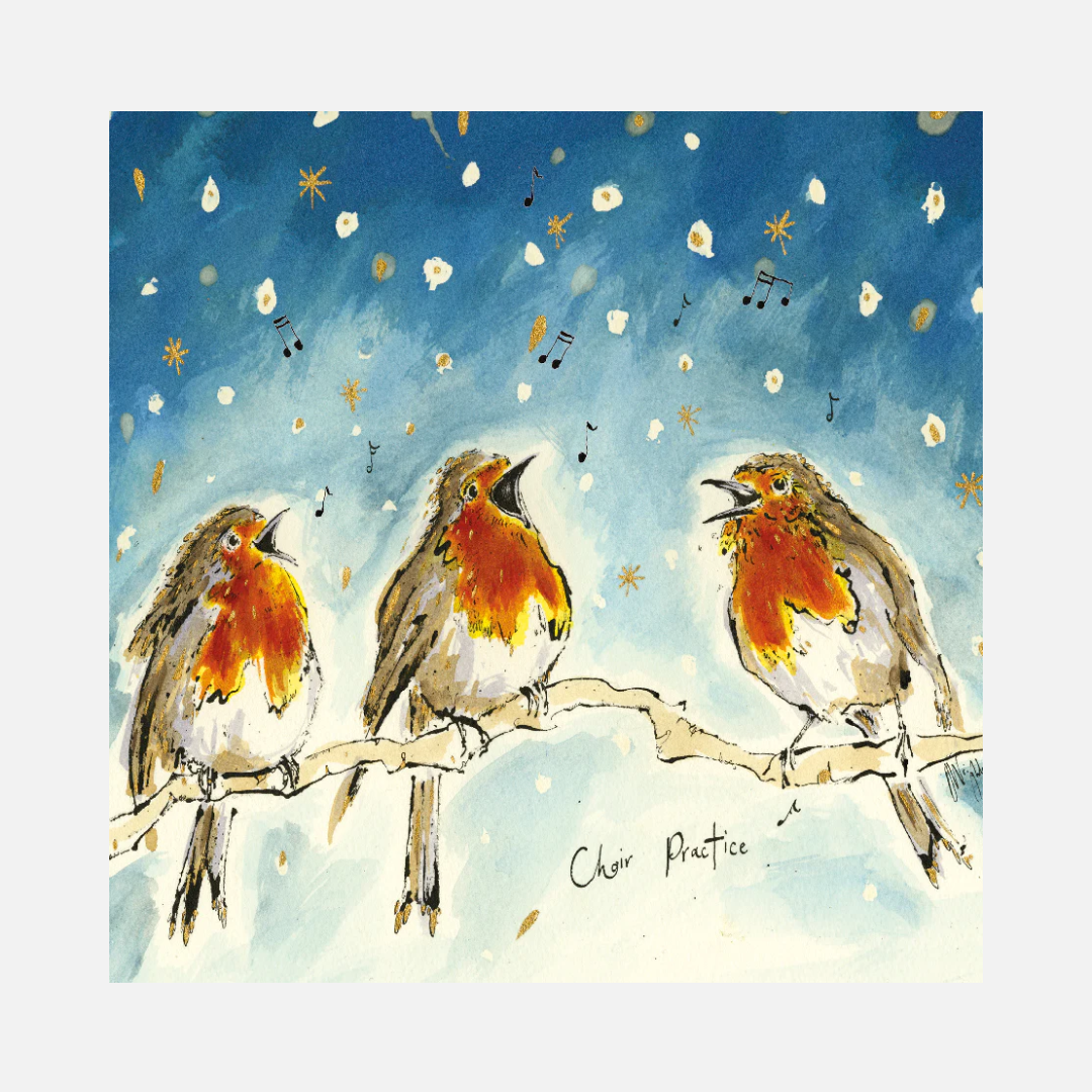 A Christmas card illustrated with three singing, red breasted, robins and the hand written text ‘Choir Practice’. Left blank inside so that you can write your own message.