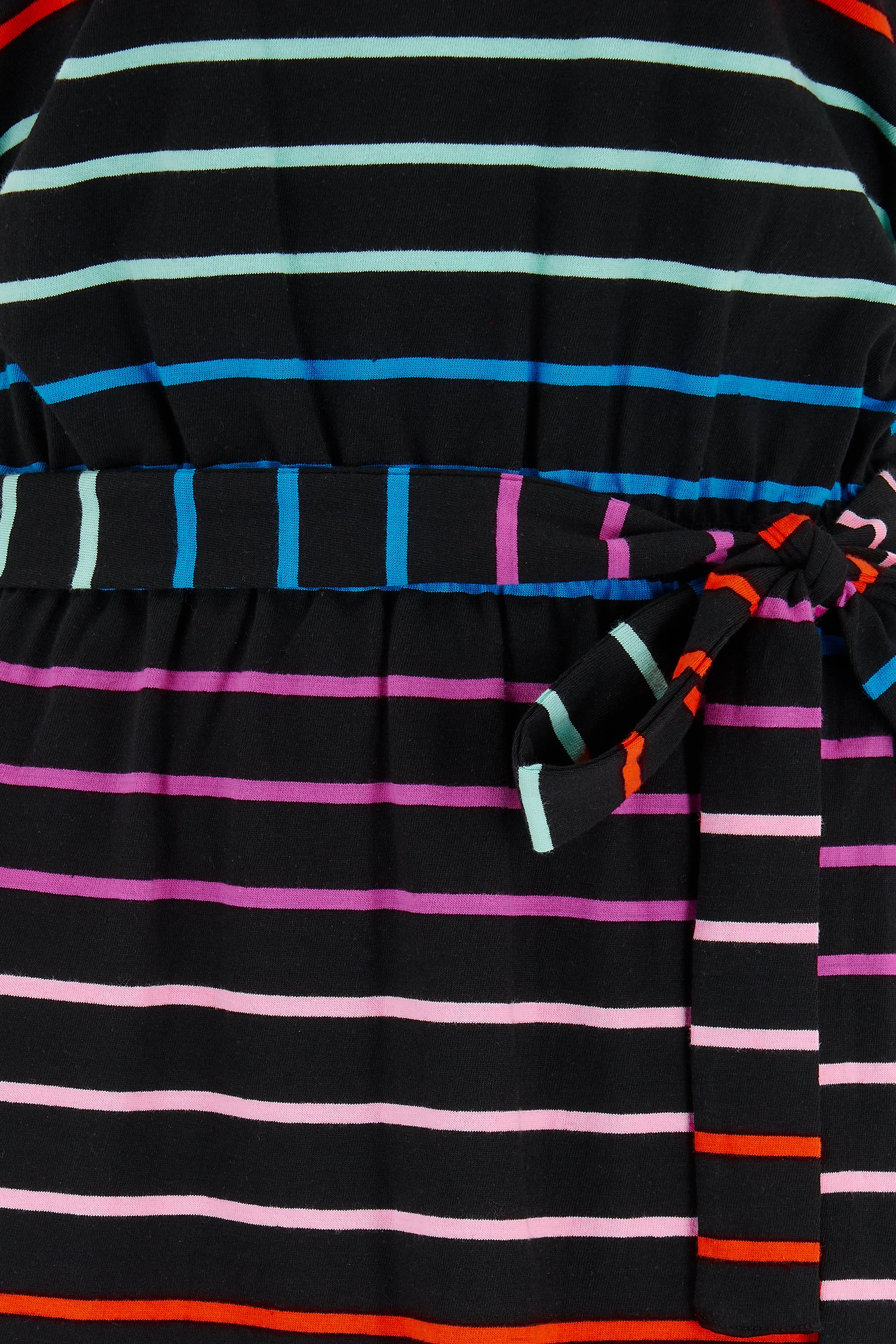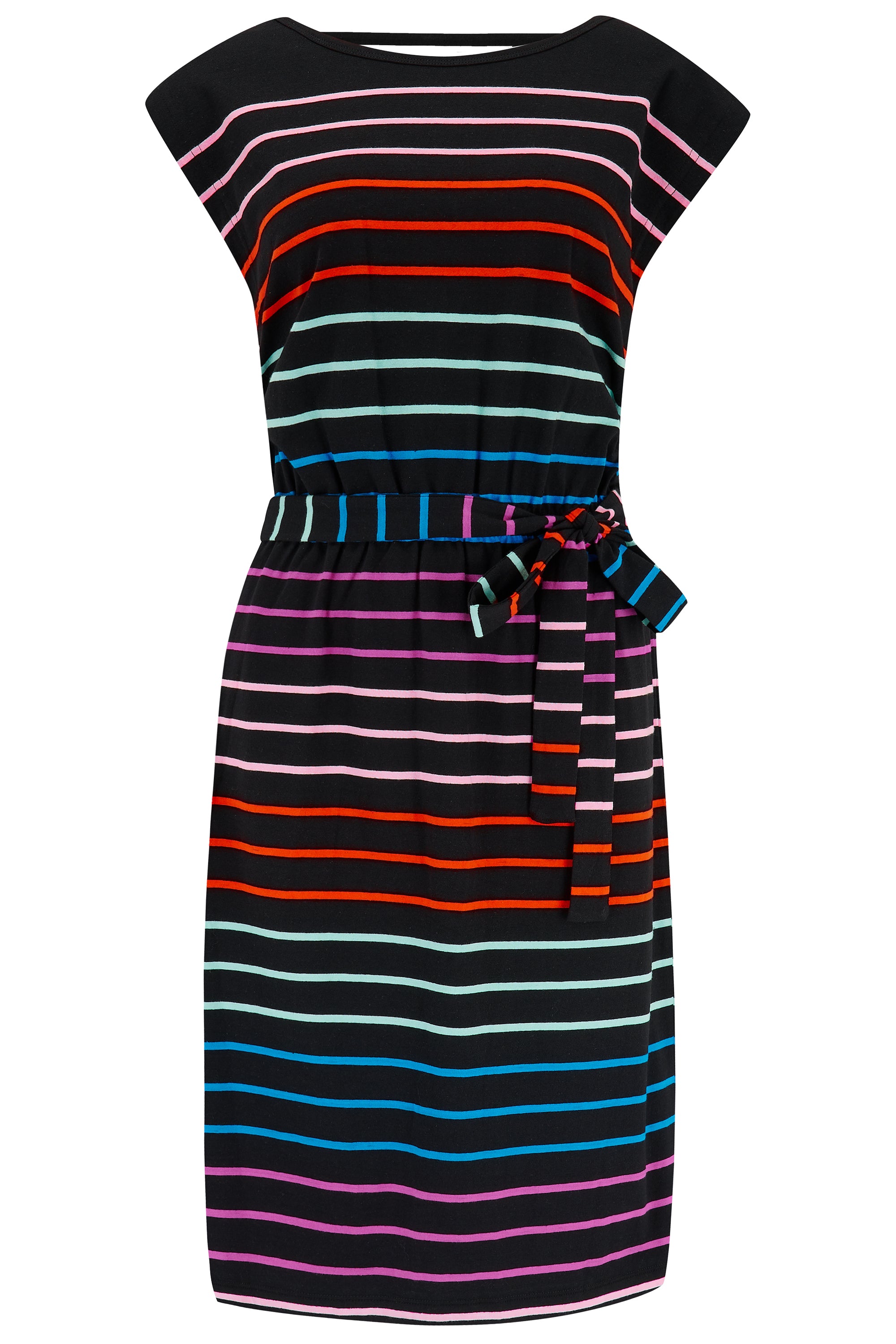 Embrace effortless style and comfort with the Hetty Jersey Dress from Sugarhill Brighton. Crafted from breathable Organic Cotton, this dress features a cutaway back detail and an elasticated shirred waist for a flattering and comfortable fit. The bold Triple Stripe print in contrasting colours on a sleek black base adds a modern twist, perfect for all-day wear.