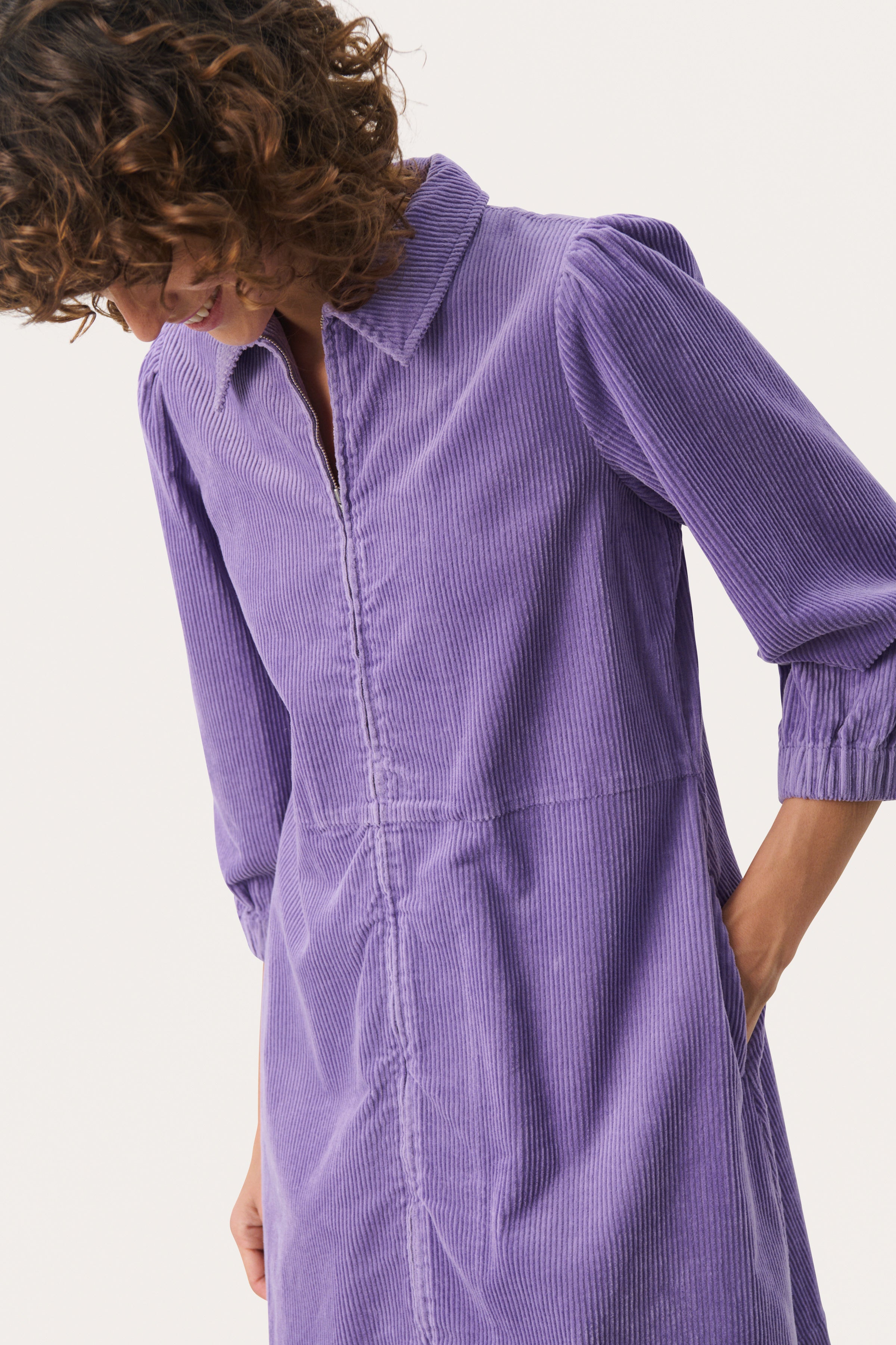 Experience the perfect blend of comfort and style with the Evyor Cord Dress in Chalk Violet. This effortlessly chic A-line shirt dress offers a relaxed yet flattering silhouette, with a collared neckline, three-quarter length sleeves, and a knee-length design. Crafted from a breathable corduroy cotton blend, it ensures both comfort and durability.