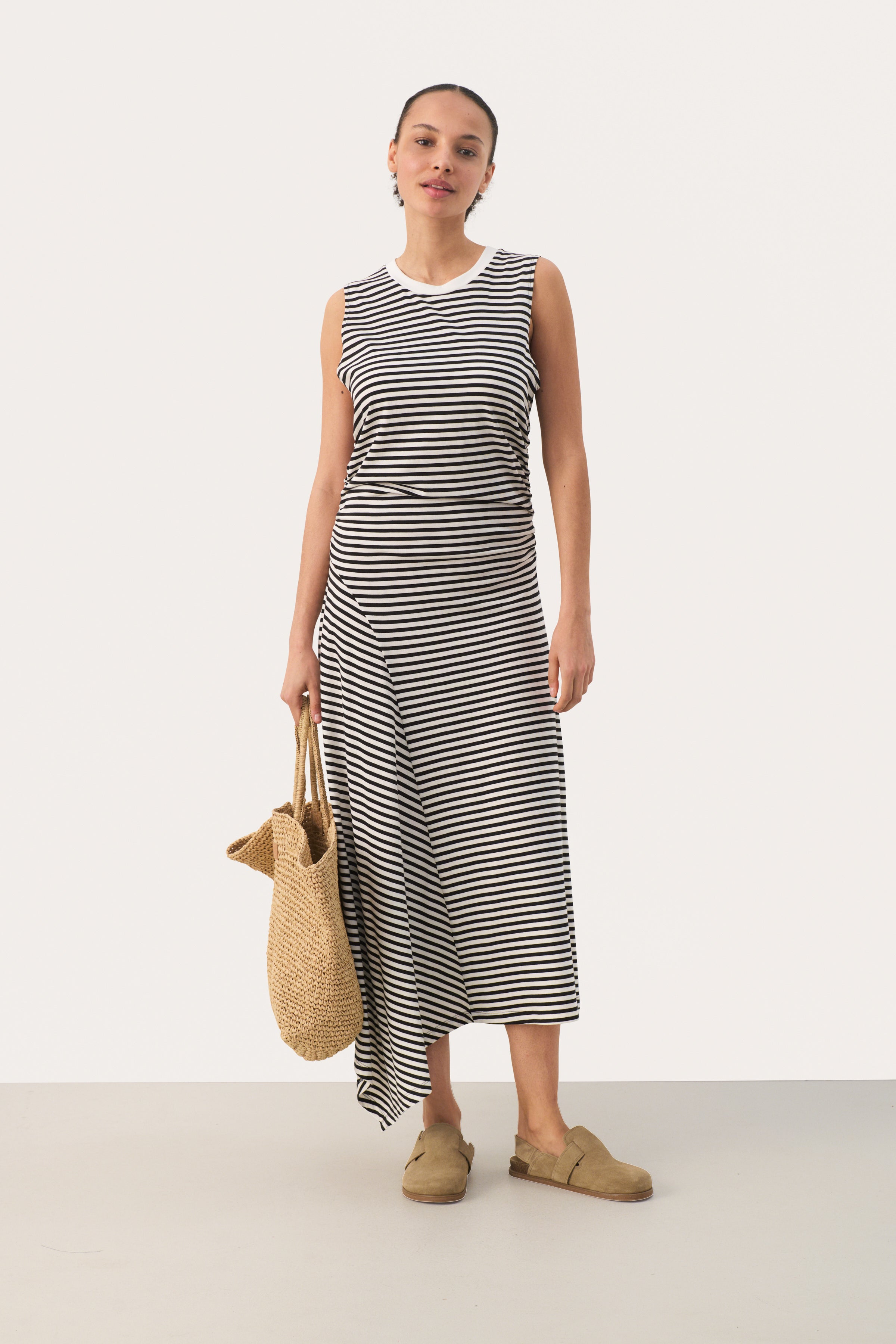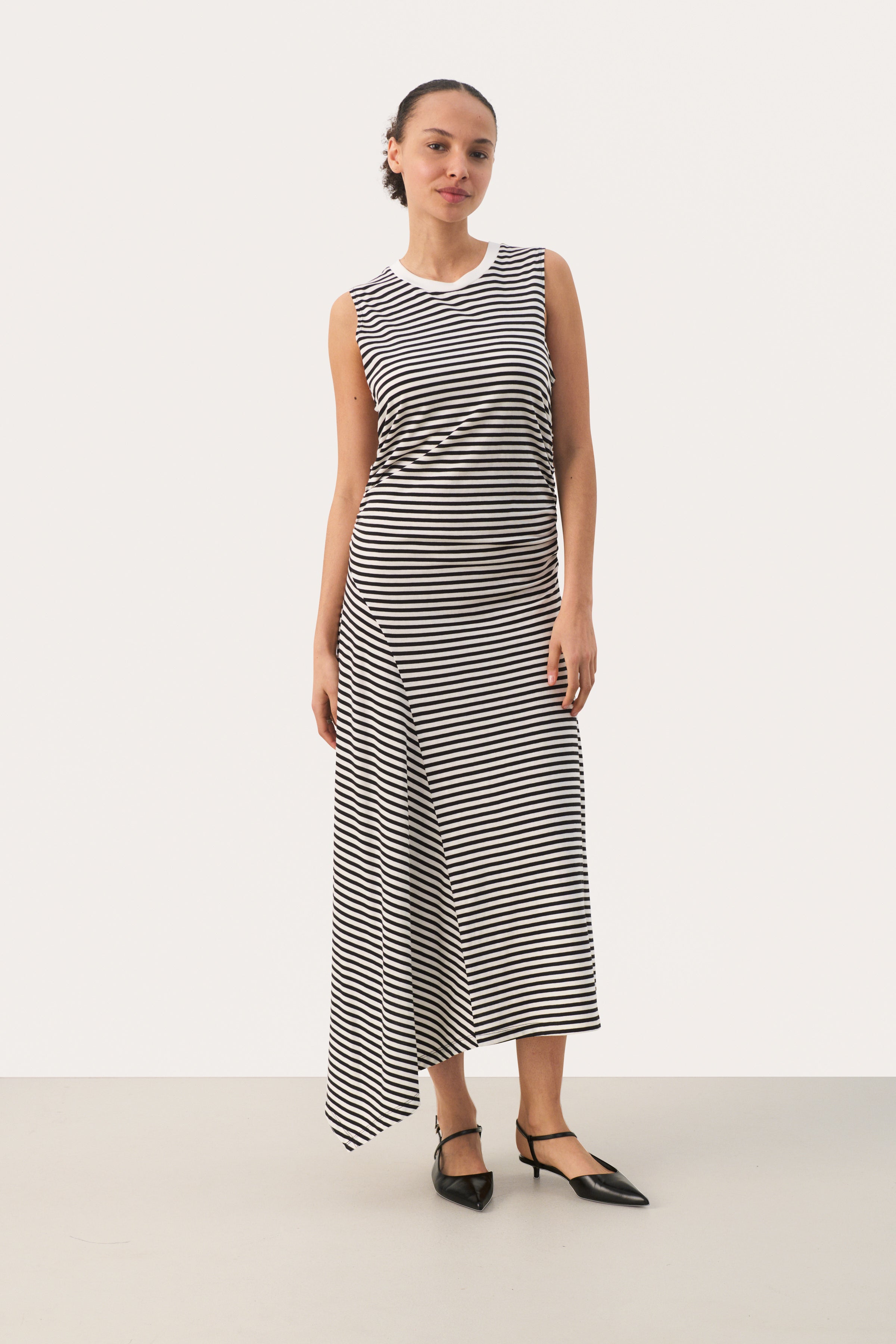 Take your style to the next level with this statement-making dress from Part Two! The sleek stripe design is sure to catch eyes, while the jersey material and ruched waistline add feminine shape and detail. With a crew neckline and asymmetrical hemline, this dress is perfect for any occasion and will elevate your wardrobe to new heights. Don't miss out on the Jeannie Dress.