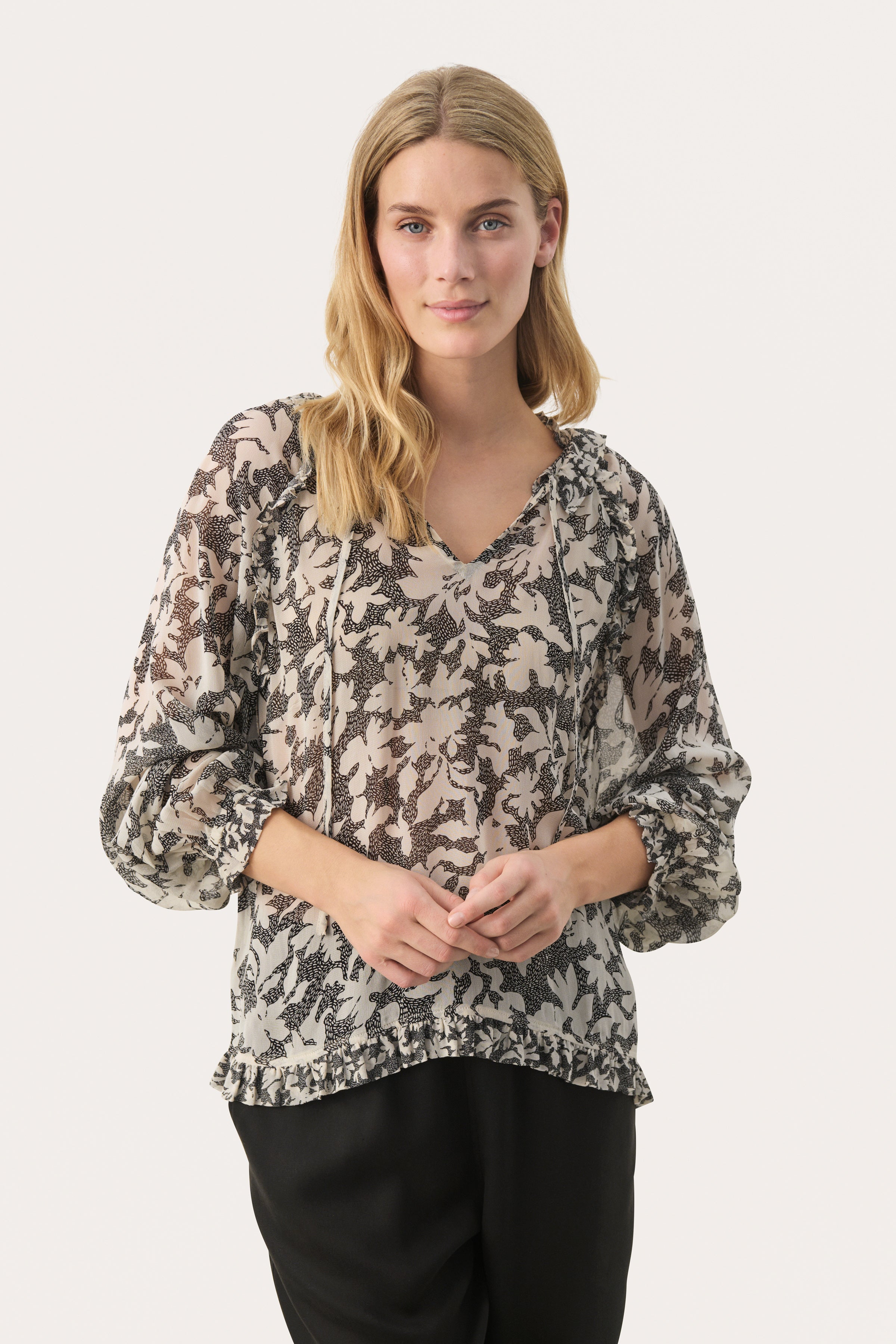 Experience the perfect blend of femininity and fun with the Joanna Blouse by Part Two. This charming top is designed with delicate features and eye-catching details, making it a must-have for any wardrobe. The V-notch tie neck and wide ruffled collar add an elegant touch, while the relaxed fit and long raglan sleeves provide effortless comfort. Adorned with frilled edges along the shoulder seams, hem, and sleeves, this blouse is finished with a lovely print that makes a statement wherever you go.
