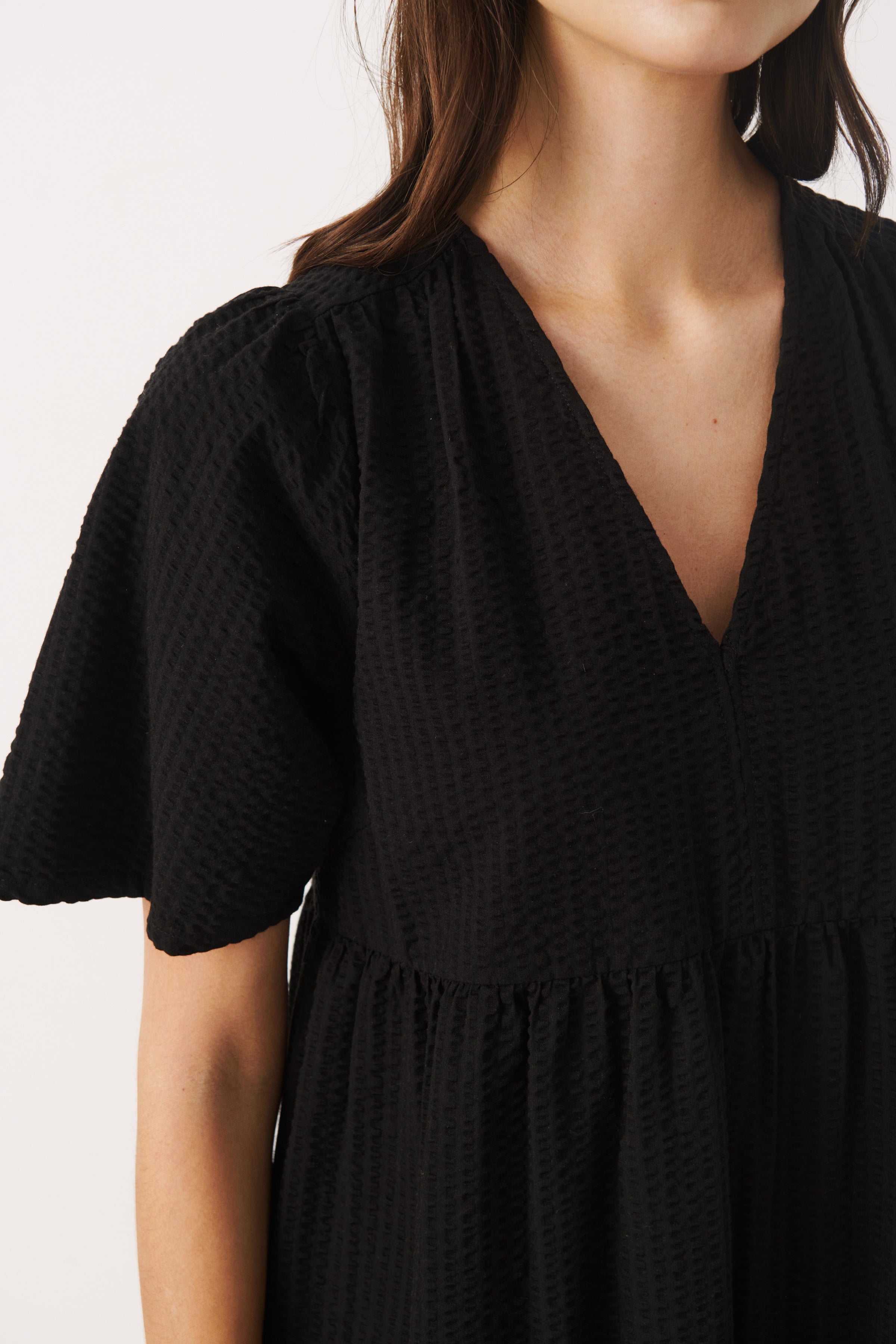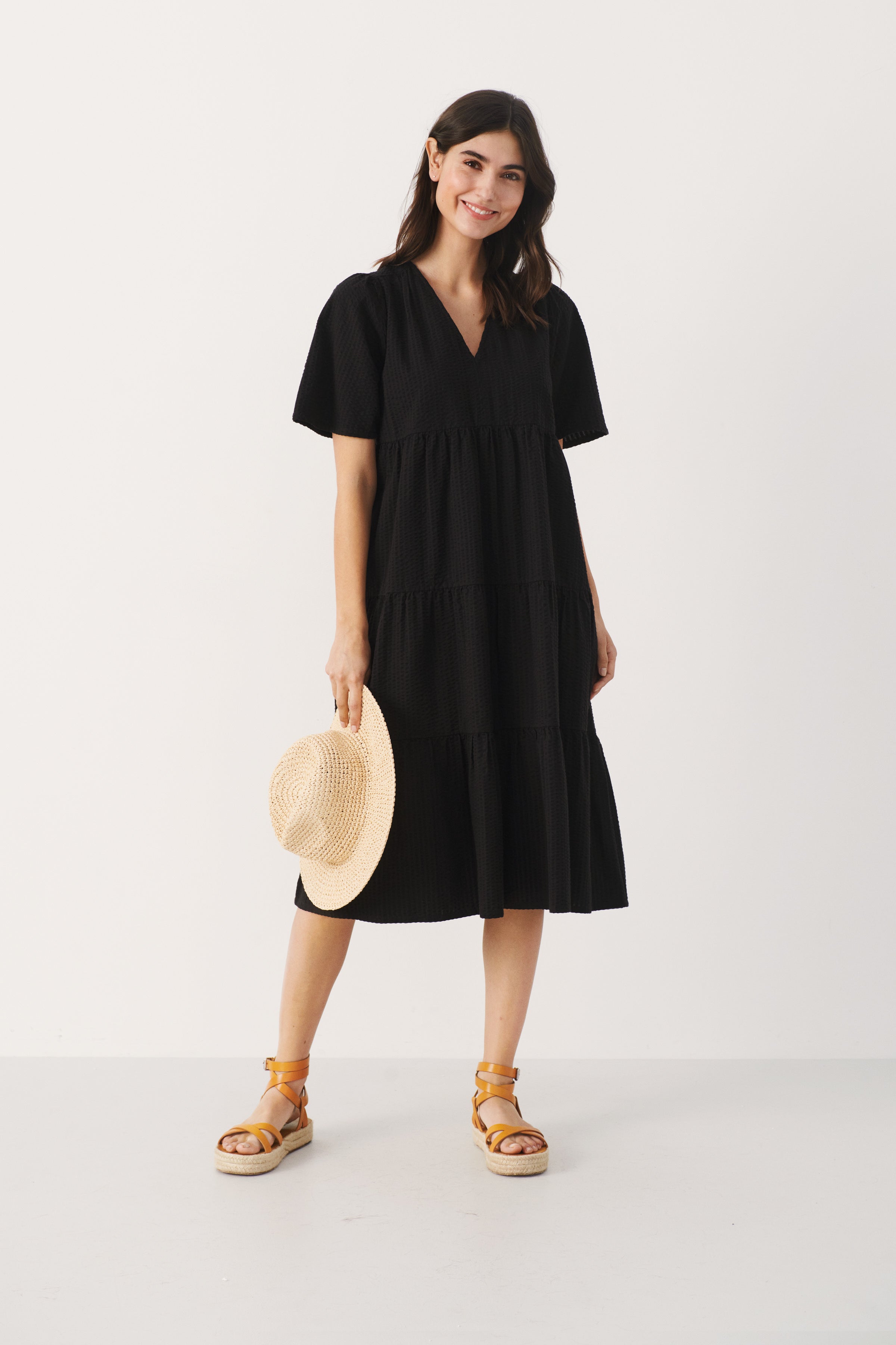 Introducing the sophisticated Pam Tiered Dress in Black from Part Two. This knee-length dress with short sleeves offers a perfect blend of elegance and comfort. Its flattering tiered design and relaxed sleeves create a stylish, effortless silhouette, making it an essential piece for any wardrobe. Crafted from lightweight cotton, this dress ensures all-day comfort, seamlessly transitioning from day to evening wear.