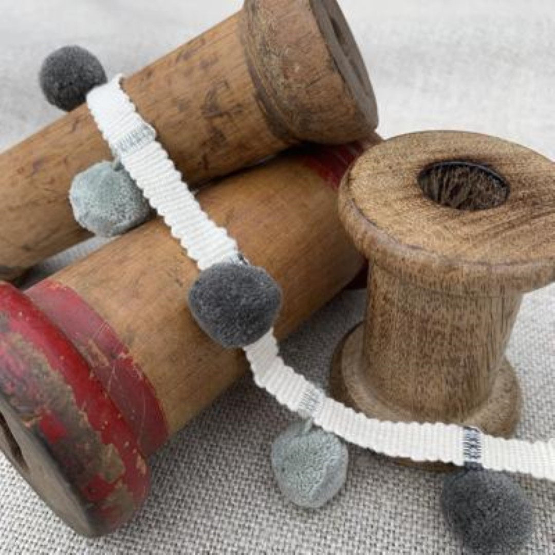 The pretty Dual Colour Pom Pom trimming from Olive & Daisy is perfect for trimming cushions, curtains, blinds, home accessories or craft projects. This trimming comes on matching braid and is available in 11 colourways to complement their gorgeous range of linen fabrics.