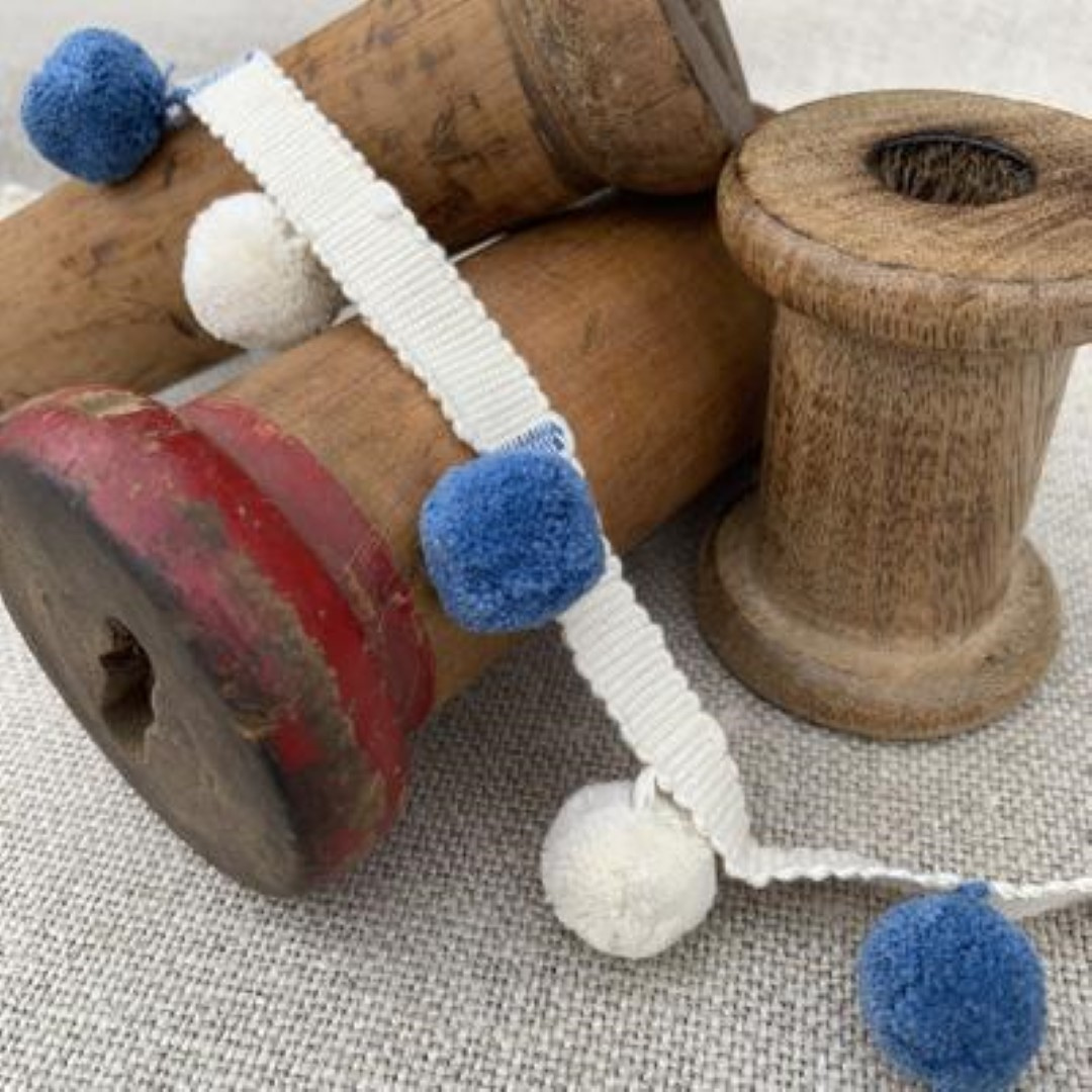The pretty Dual Colour Pom Pom trimming from Olive & Daisy is perfect for trimming cushions, curtains, blinds, home accessories or craft projects. This trimming comes on matching braid and is available in 11 colourways to complement their gorgeous range of linen fabrics.