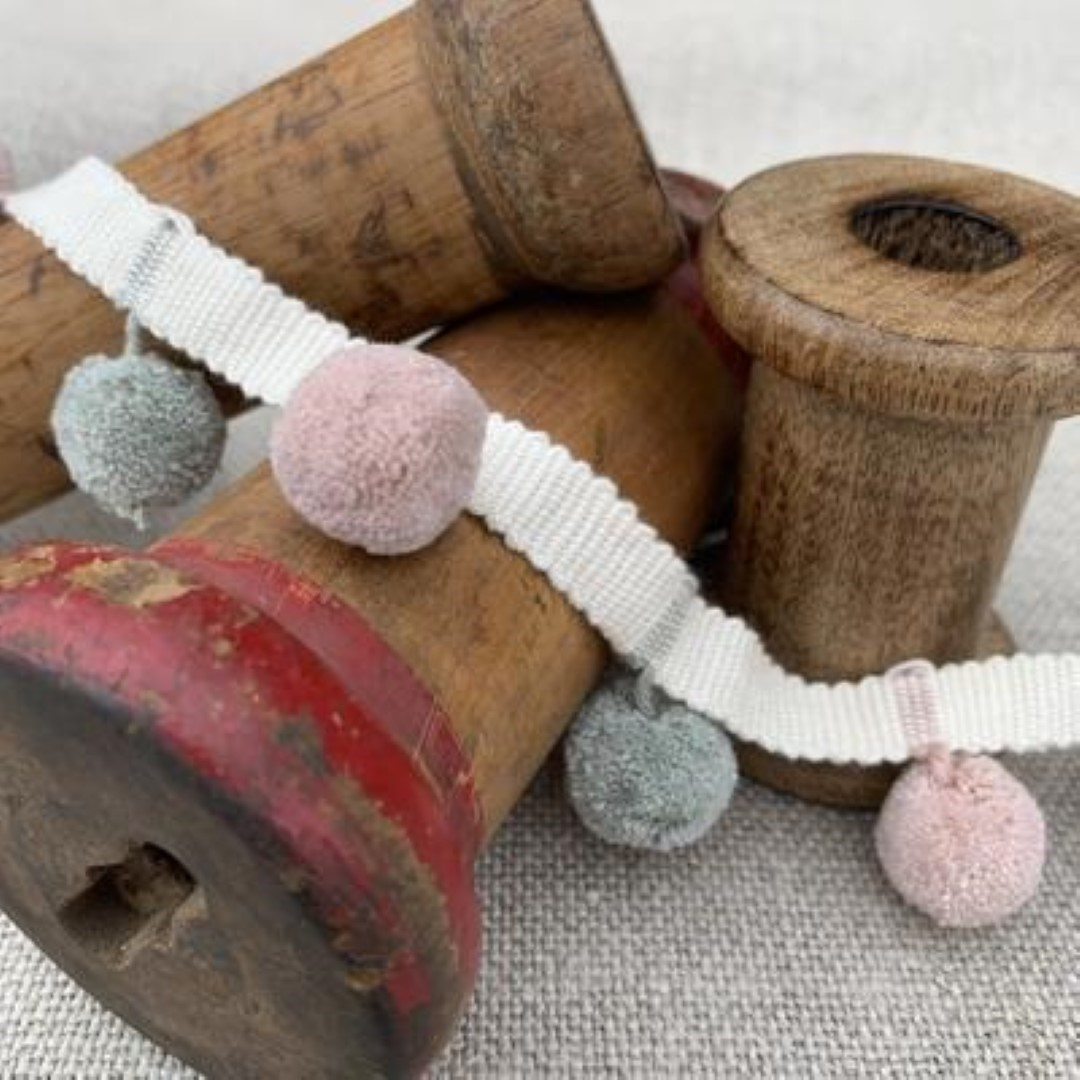 The pretty Dual Colour Pom Pom trimming from Olive & Daisy is perfect for trimming cushions, curtains, blinds, home accessories or craft projects. This trimming comes on matching braid and is available in 11 colourways to complement their gorgeous range of linen fabrics.