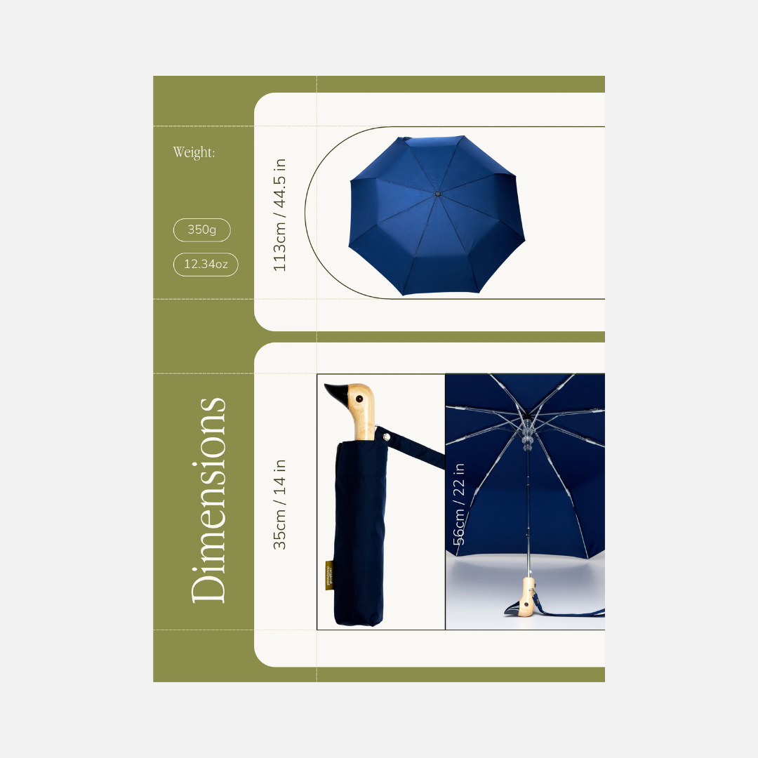 Experience the perfect blend of sustainability and functionality with our Eco-Friendly Compact Duck Umbrella in Navy Blue. Made entirely from recycled plastic bottles, each canopy is designed with the environment in mind, without sacrificing performance.