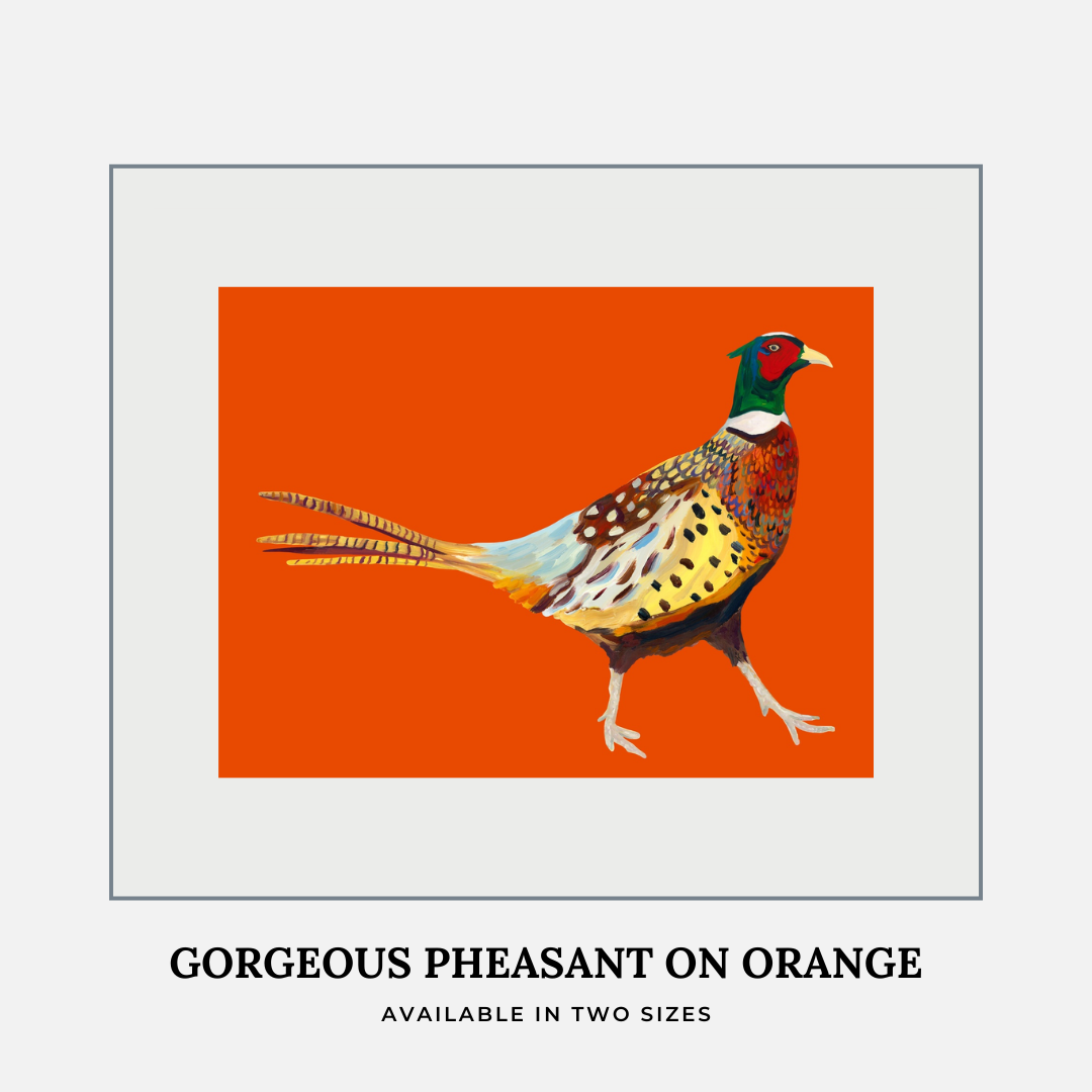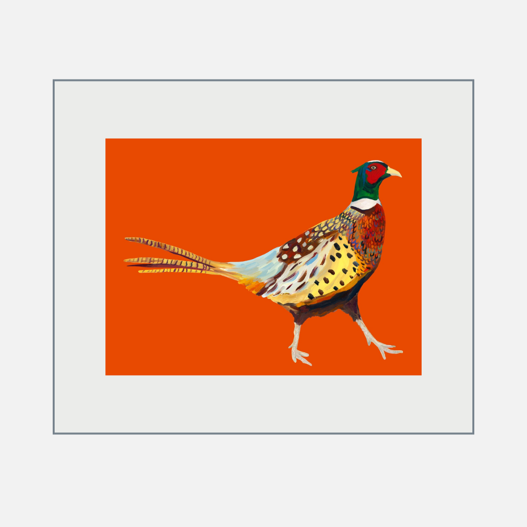 A stunning print of an oil painting by the incredibly talented London based artist Alice Straker, featuring a strutting Cock Pheasant set on a vibrant orange background. Gorgeous Mr Pheasant is part of the English Game Birds Collection.