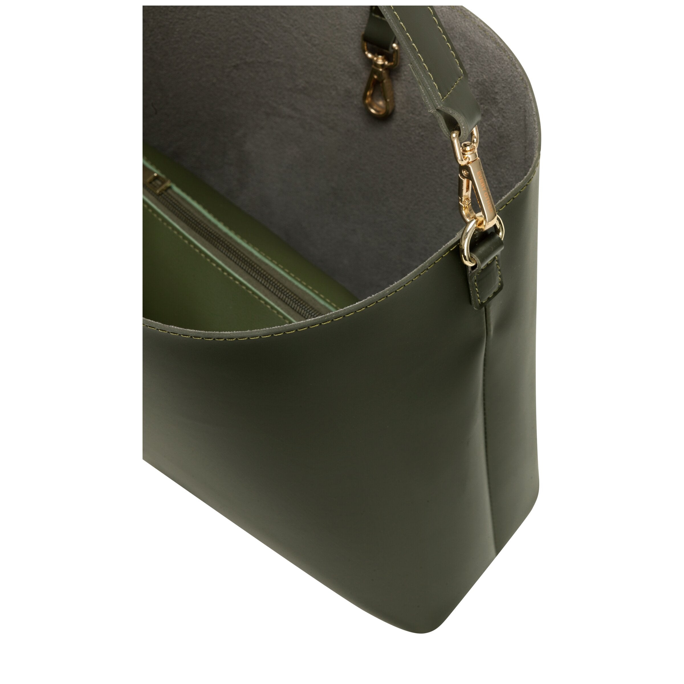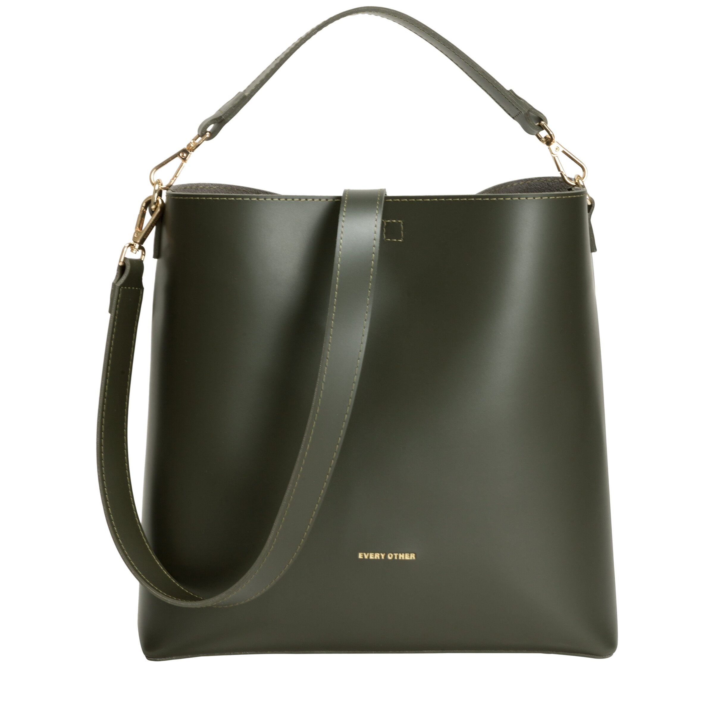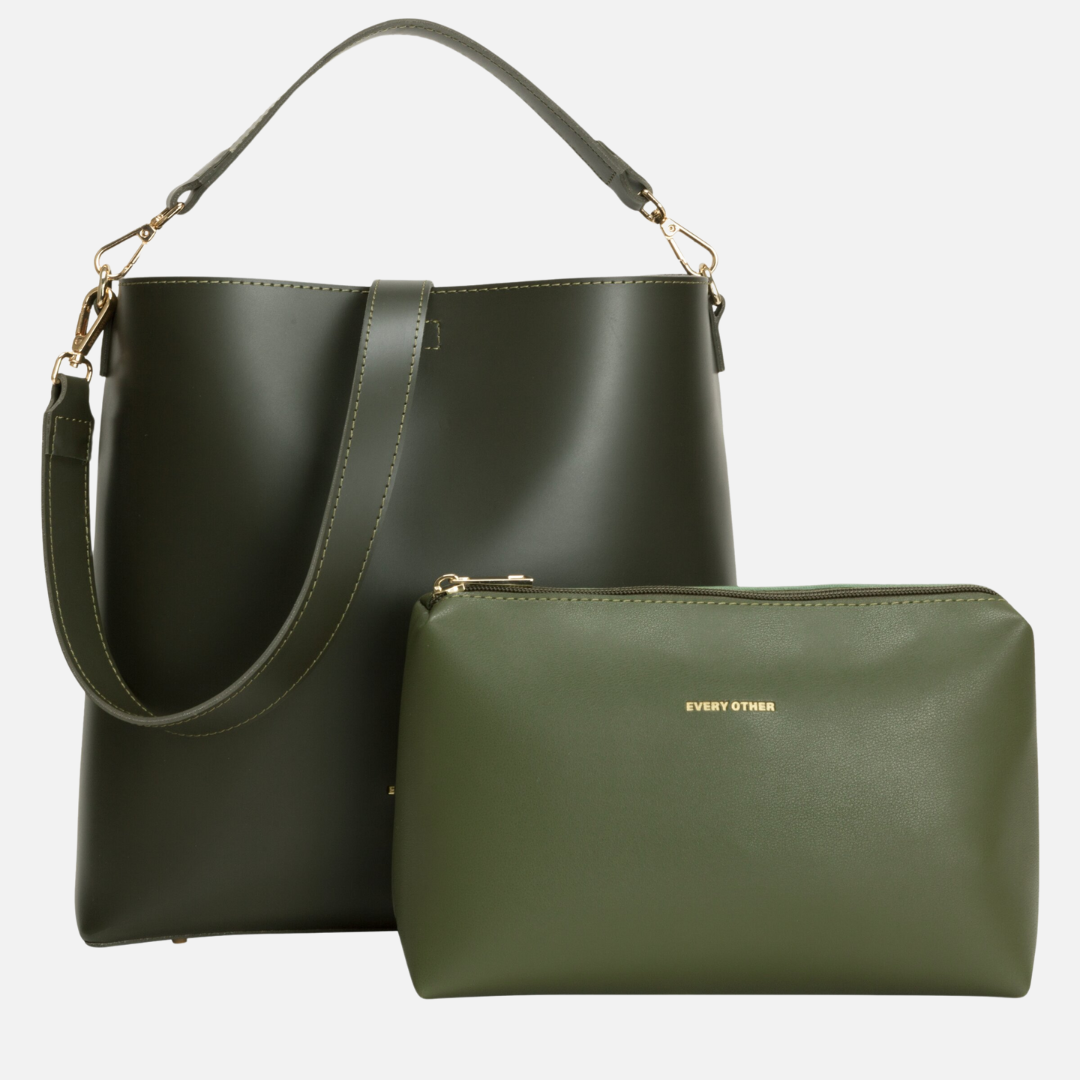 Unite style and function with this bucket tote bag in dark green from Every Other. Equipped with a detachable strap and handy pouch you'll be ready for any occasion. This timeless style makes the perfect wardrobe essential.