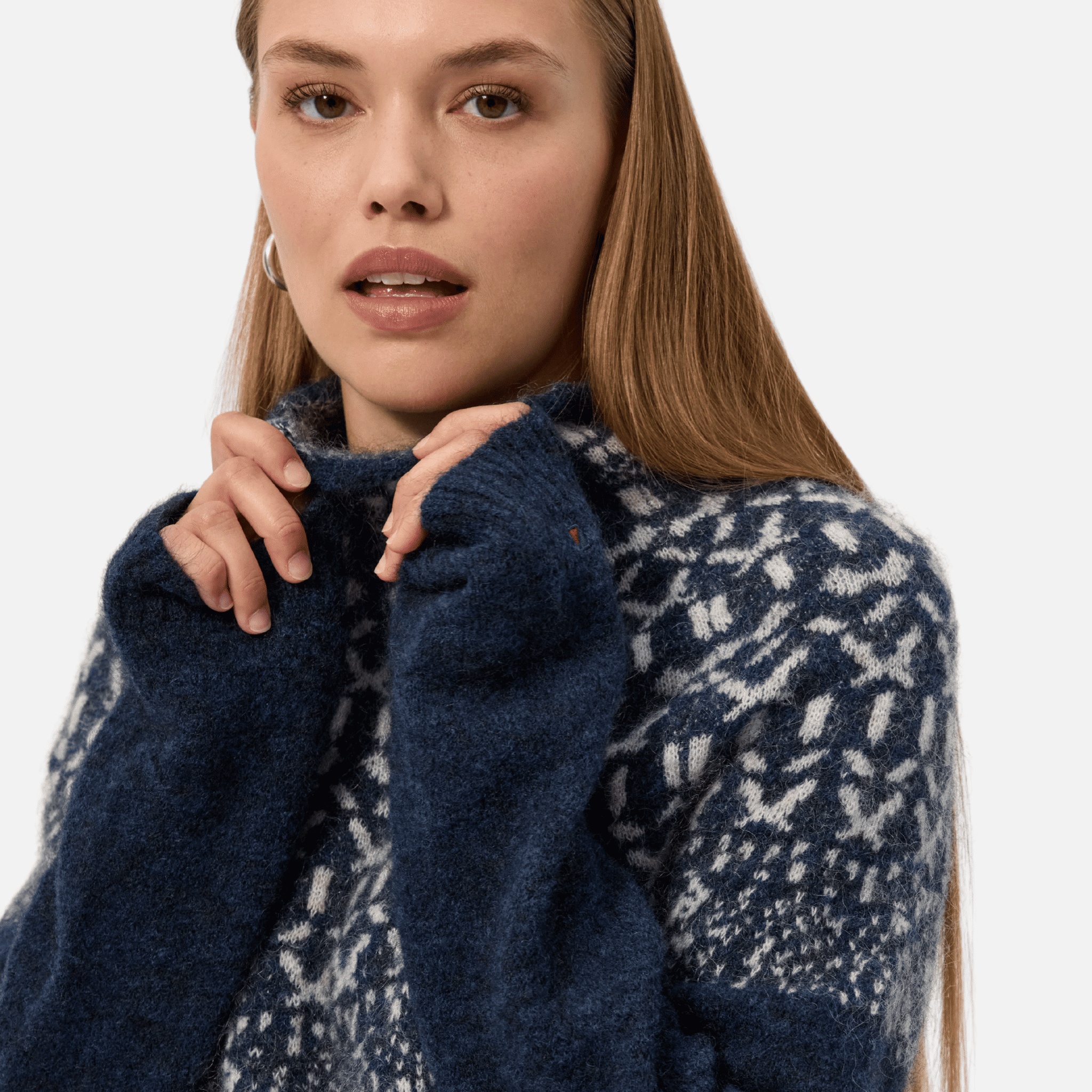 The Jesebel Pullover in Navy by Red Green is a classic Nordic-inspired knit, crafted in a brushed mohair and wool blend for a soft and cosy feel. Designed with a high neck, ribbed edges, and a relaxed fit, it’s the perfect companion for cold days while adding timeless style to your winter wardrobe.