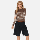 The Mila Striped Pullover by Saint Tropez is a timeless knit with a modern twist. Designed with a flattering crew neckline and long sleeves, this soft pullover is finished with a classic horizontal stripe in a rich chocolate tone paired and cream. A versatile piece that’s perfect for layering or wearing solo, it adds effortless style to any wardrobe.