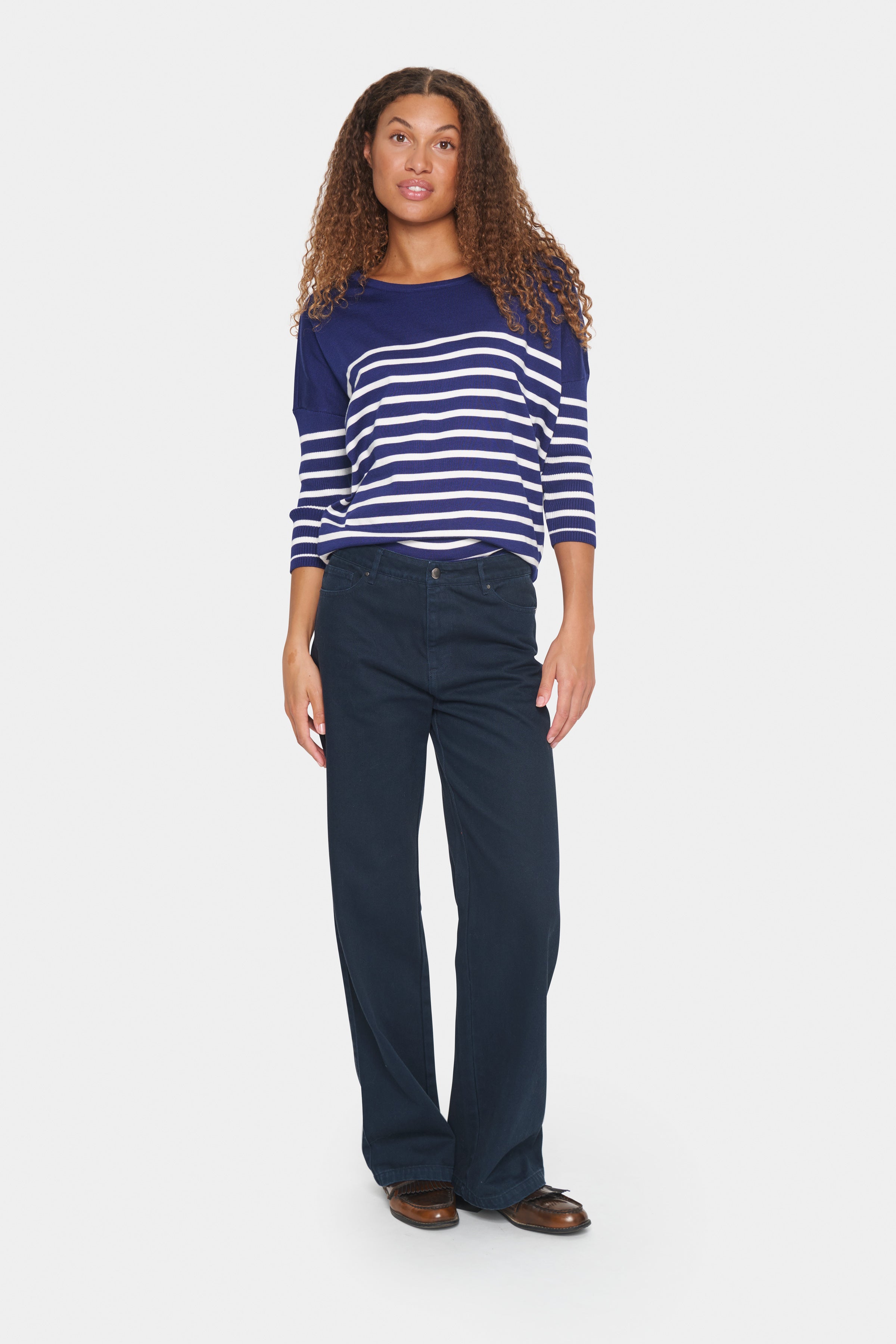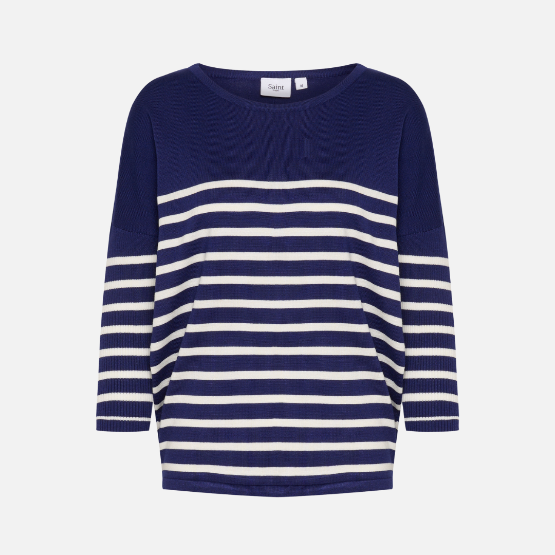 The Mila Round Neck Pullover in Midnight Sail Stripe by Saint Tropez combines timeless style with a touch of nautical charm. Featuring a classic stripe pattern in deep midnight hues, this jumper has a round neckline, 3/4 sleeves, and dropped shoulders, offering a relaxed and flattering fit. Ribbed detailing at the neckline, sleeves, and hem adds texture, while the lightweight, flowy fabric ensures all-day comfort.