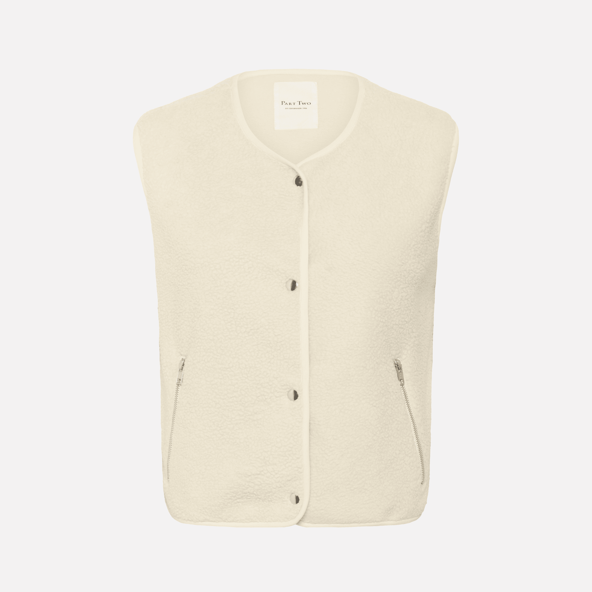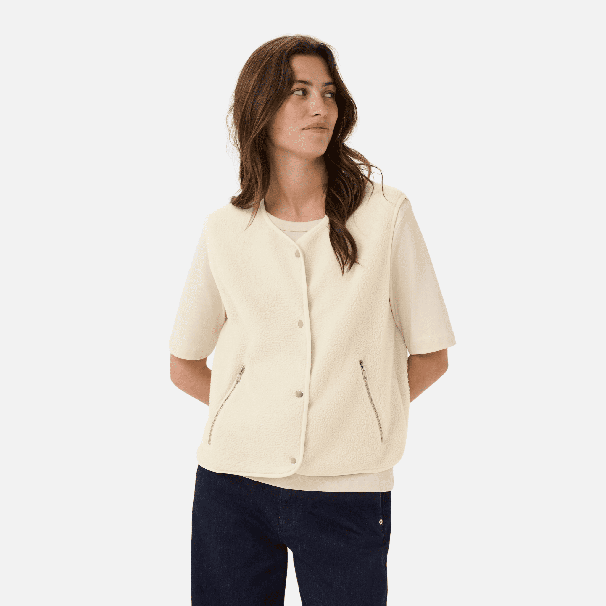 The Signy Waistcoat in Oatmeal by Part Two is a versatile layering piece designed for transitional dressing. Made from soft teddy fleece with a slightly boxy fit, it combines warmth and style without adding bulk. Featuring snap button closure and zipped front pockets, this sleeveless vest is both practical and chic – perfect over a T-shirt or layered under a coat.