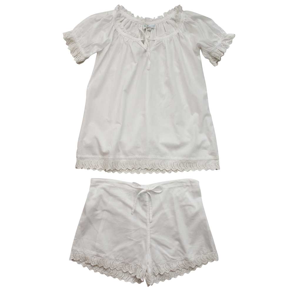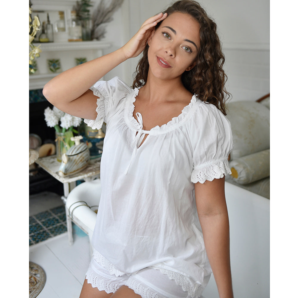 Experience the luxurious elegance of Powell Craft's White Ruffles short pyjama set. The top boasts a stunning ruched neckline adorned with beautiful broderie anglaise trims on the sleeves and hem. The shorts, complete with a drawstring waist for a perfect fit, are decorated with broderie anglaise trim along the hems. Light and comfortable, this pyjama set is a must-have for travellers or those who struggle with overheating at night.