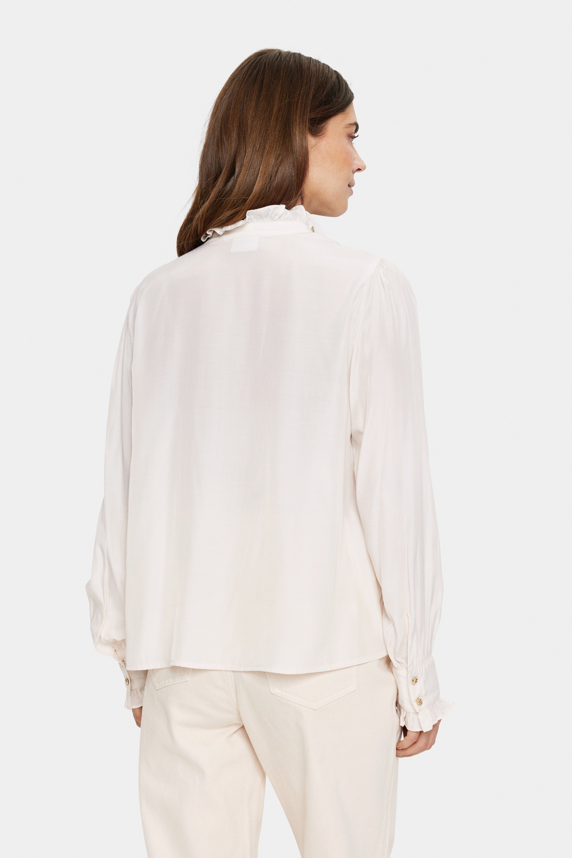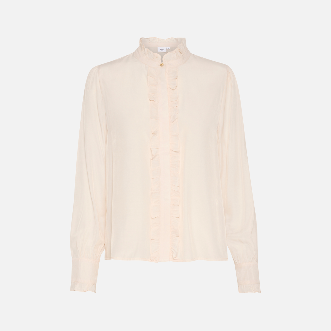 Elegant and feminine, the Felina Shirt by Saint Tropez is a versatile wardrobe staple that works for any occasion. Designed with delicate details, it features a frilled mandarin collar and a hidden button placket adorned with soft frills on both sides for a refined, romantic touch. The long sleeves have a straight fit and are gently gathered into buttoned cuffs with frilled edges, adding subtle sophistication. With its regular fit, this blouse is both flattering and effortlessly chic.