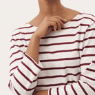 The Nela T-Shirt in Tawny Port Stripe by Part Two is a versatile everyday essential with a classic striped design and a flattering boat neckline. Crafted from 100% organic cotton, it feels soft and breathable against the skin, while the regular fit and 3/4 sleeves make it a comfortable choice for year-round wear.