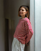 Crafted from a soft cotton-blend loop-back fabric, the Rebecca Stripe Top by Chalk UK combines comfort with a clean, modern silhouette. Its relaxed boxy fit and classic detailing make it an effortless piece for everyday wear.
