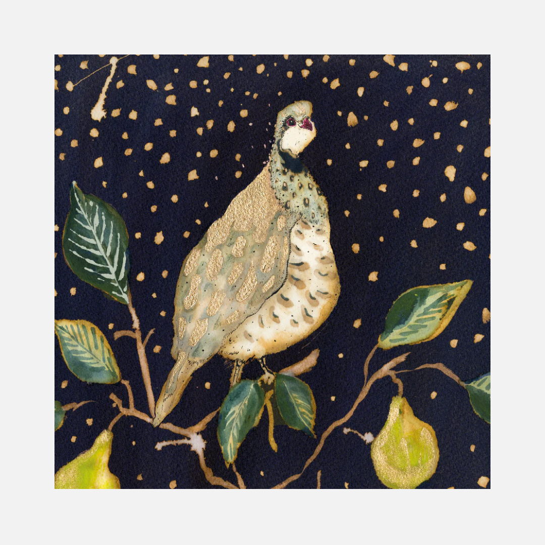 A Christmas card illustrated with a partridge sitting in a pear tree under the starry sky. Left blank inside so that you can write your own message.