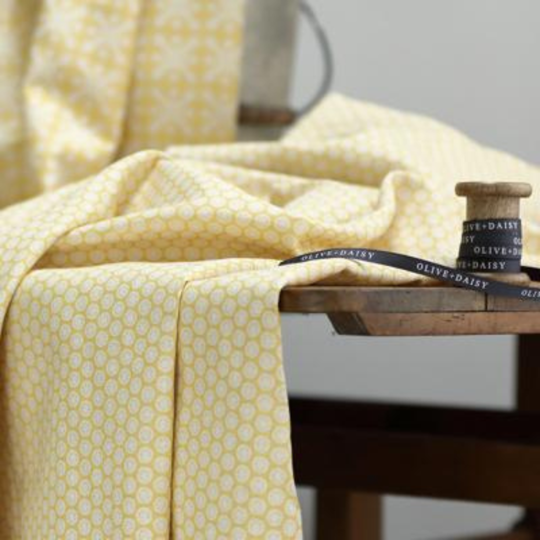 The stunning Agnes Blotch design from Olive & Daisy features a two-tone, small scale geometric pattern. It has a softly coloured classic palette with a small circlular motif .This print is available in 5 gorgeous colourways.