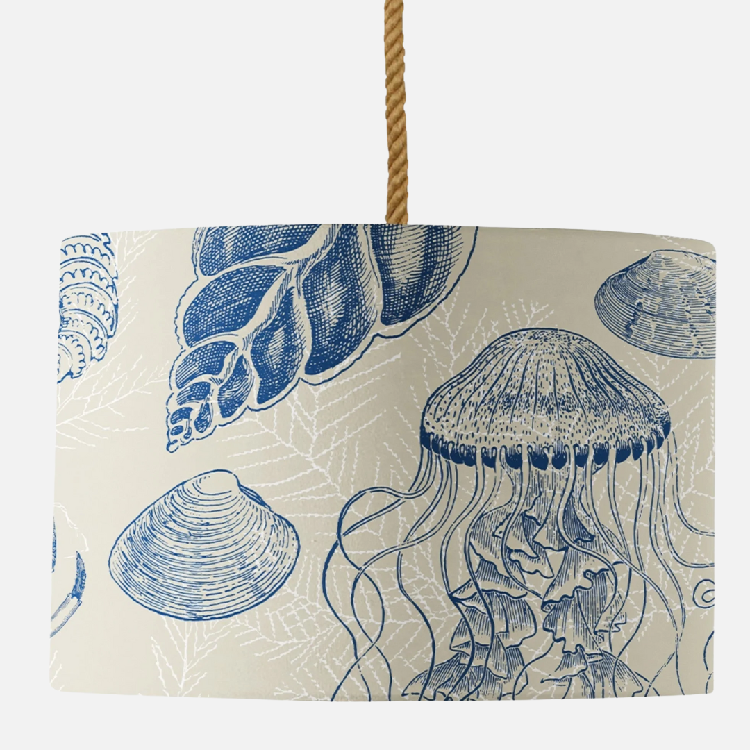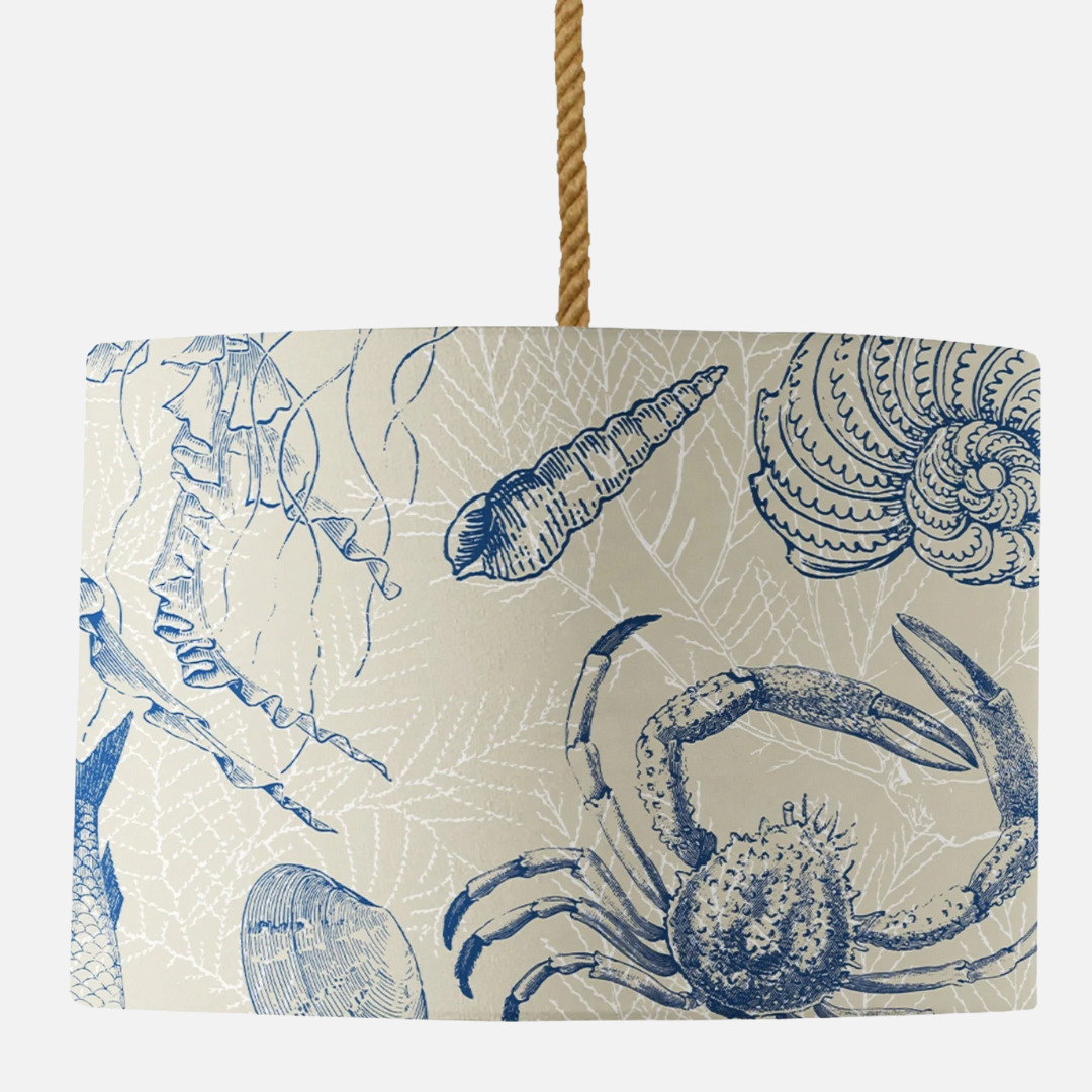 A stunning shade featuring a classic blue antiquarian sealife design set on a neutral background. Anyone who loves sea life will love this design. This lovely shade works really well for coastal homes and interiors.