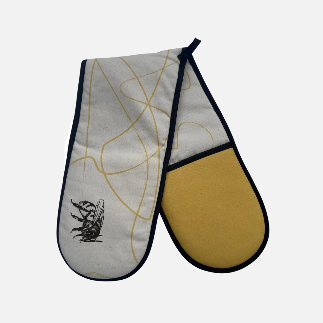 The Bee Swirl double oven gloves from Mustard & Gray are both practical and stylish. With a polyester thermal layer inside each hand pocket and on the reverse of the glove keeping you well protected. You will also find a loop that is handy for hanging up in your kitchen. These oven gloves make the perfect kitchen companion.