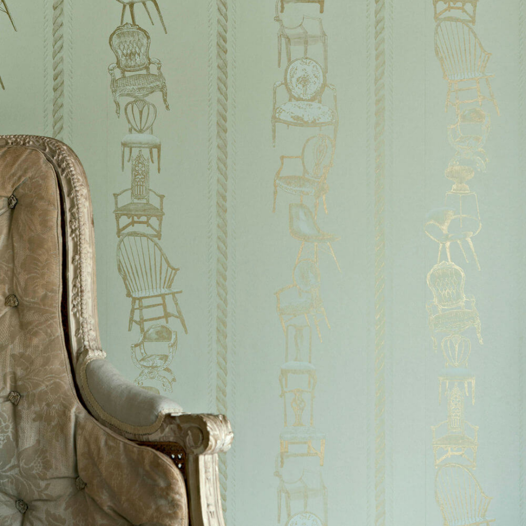 The fantastic Chairs design from Barneby Gates brings together a hand-drawn collection of some of their favourite chairs. From from antique Chippendales, Louis XVs and Windsors, to mid-century beauties by Arne Jacobsen and Norman Cherner, and modern classics by Philippe Starck. This wallpaper is available in 2 gorgeous colourways.