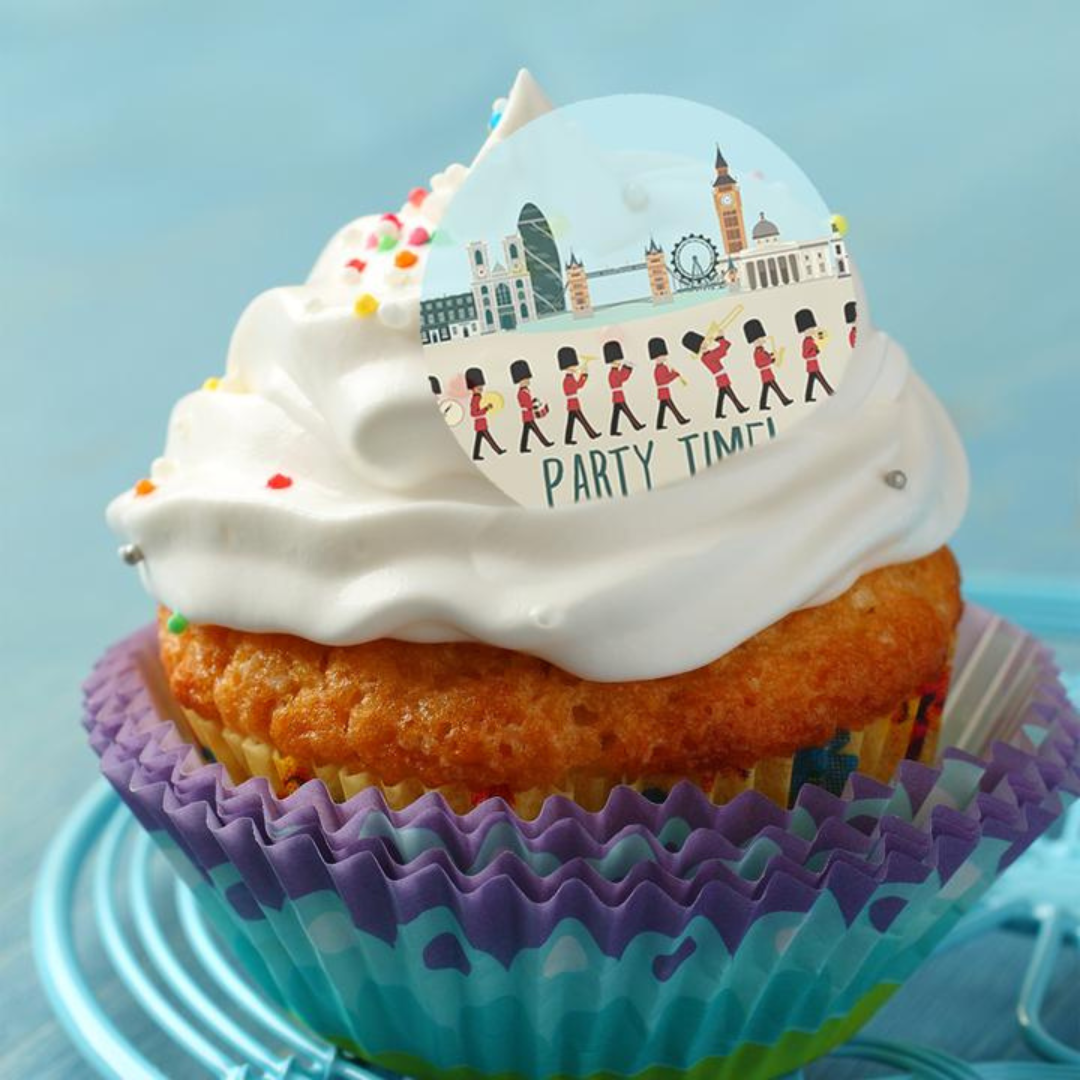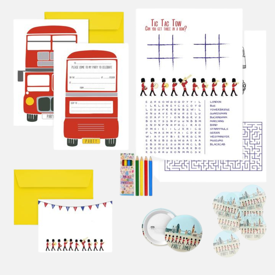 Children's themed birthday party box in the Changing of the Guard design from Mustard & Gray. This Party Box contains all the stationery you need to throw a fantastic party for even the most discerning children. These party boxes include invitations and envelopes, party badges, rice paper cake toppers, activity sheets, crayons, thank you note cards and envelopes.