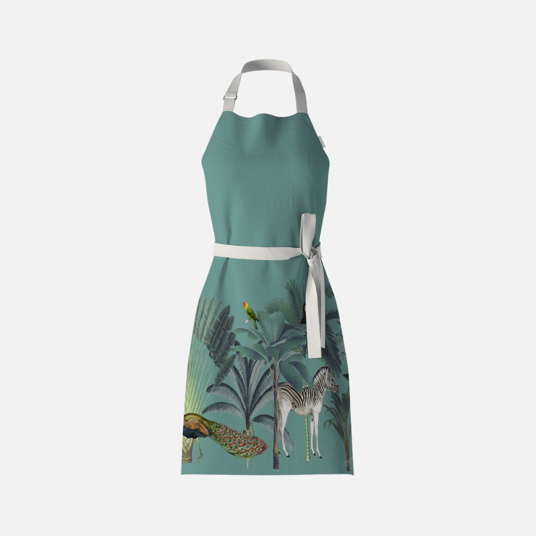 A colourful apron from Mustard & Gray featuring eye-catching animals and palms set on a green background. The design, which uses Asian vintage prints, features a leopard, zebra, peacock and palm trees. A collection inspired by naturalist, geologist and biologist Charles Darwin.