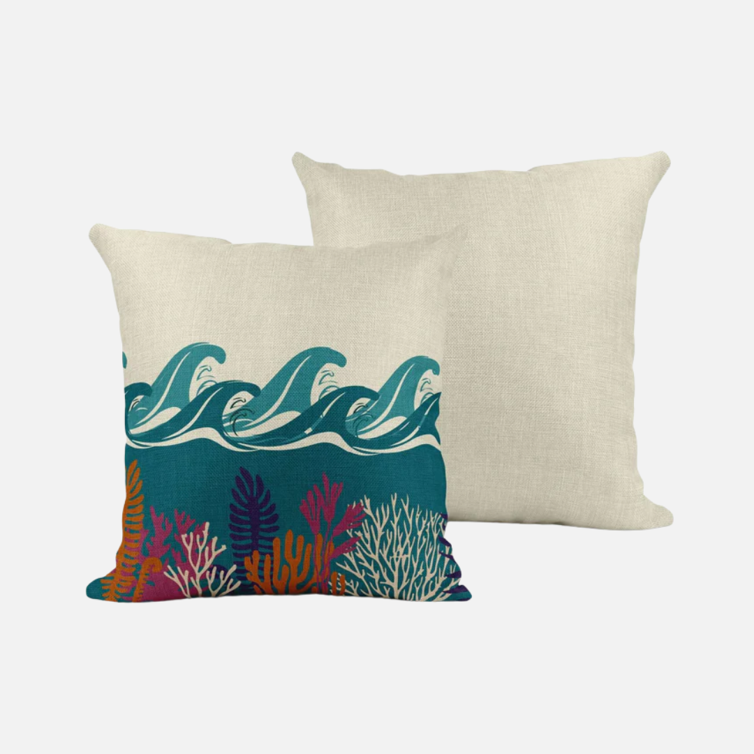 A striking cushion from Mustard & Gray featuring vibrantly coloured waves and coral set on a neutral background. Anyone who loves sea life will love this design. This lovely shade works really well for coastal homes and interiors.