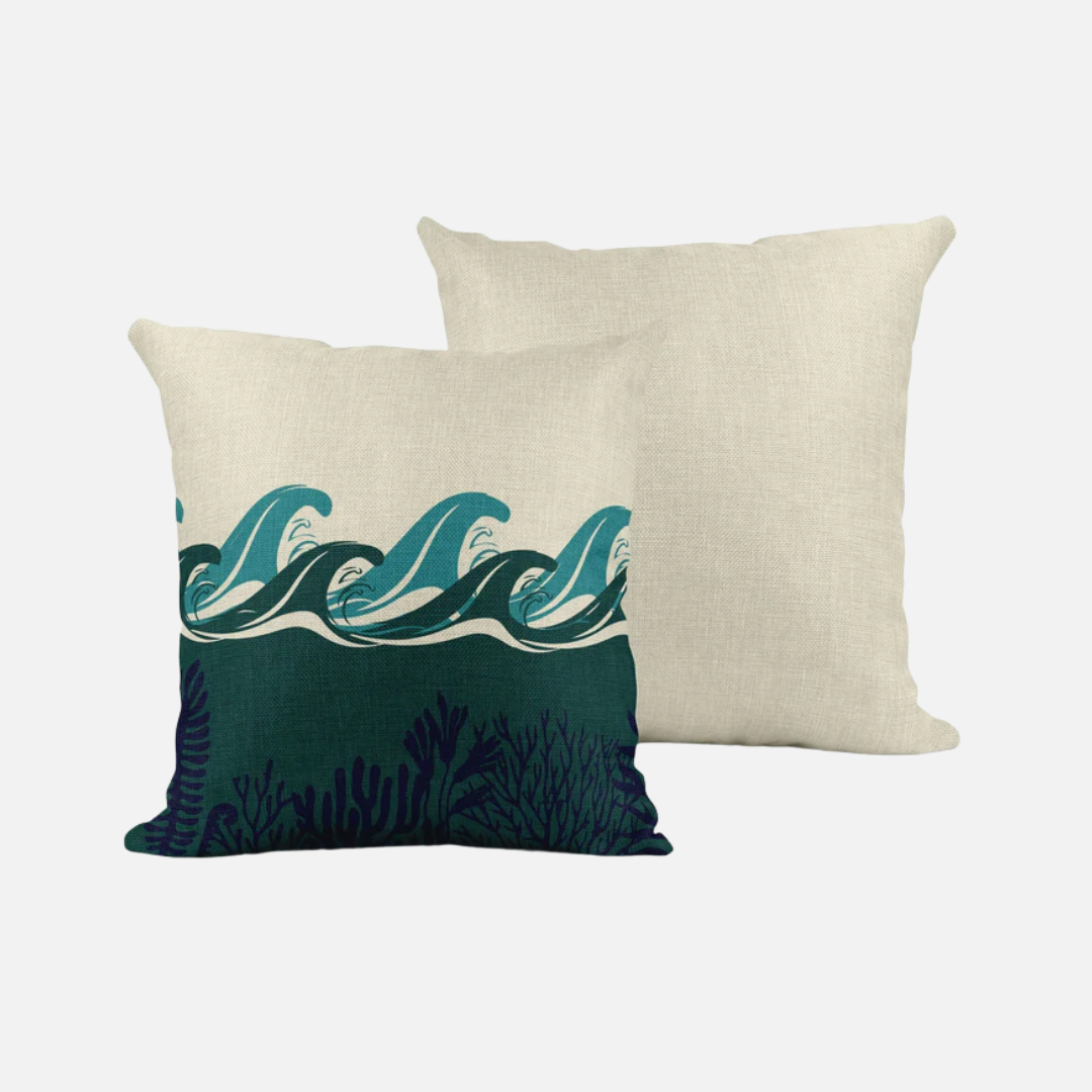 A striking cushion from Mustard & Gray featuring moody blue coloured waves and coral set on a neutral background. Anyone who loves sea life will love this design. This lovely shade works really well for coastal homes and interiors.