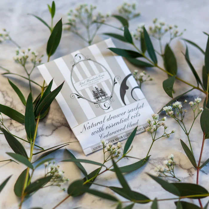 This moth-repelling Cedarwood Drawer Sachet is specially crafted for Total Wardrobe Care, blending natural ingredients like Cedarwood, Lemongrass, May Chang, Fir, Thyme, Rosemary, and Clove Bud. Each ingredient is carefully selected for its unique properties, helping to keep your wardrobes and soft furnishings fresh and moth-free.