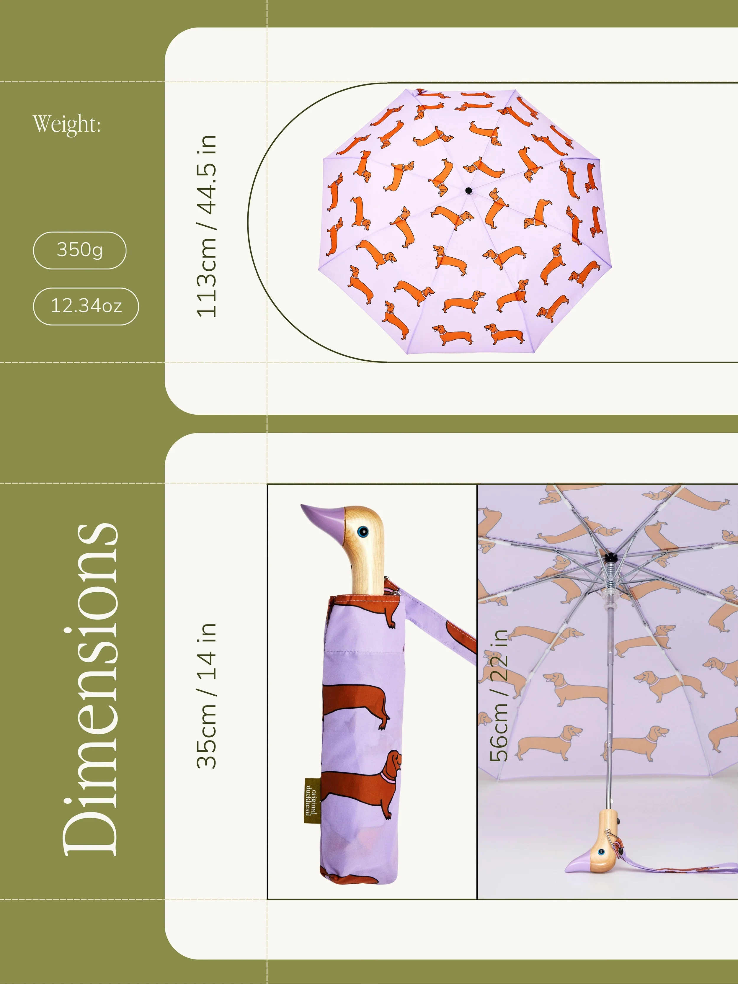 Introducing the Eco-Friendly Compact Duck Umbrella in soft lilac Dachshund Dog by Original Duckhead! Perfect for everyday use, this umbrella is designed with durability in mind to accompany you on all your adventures.