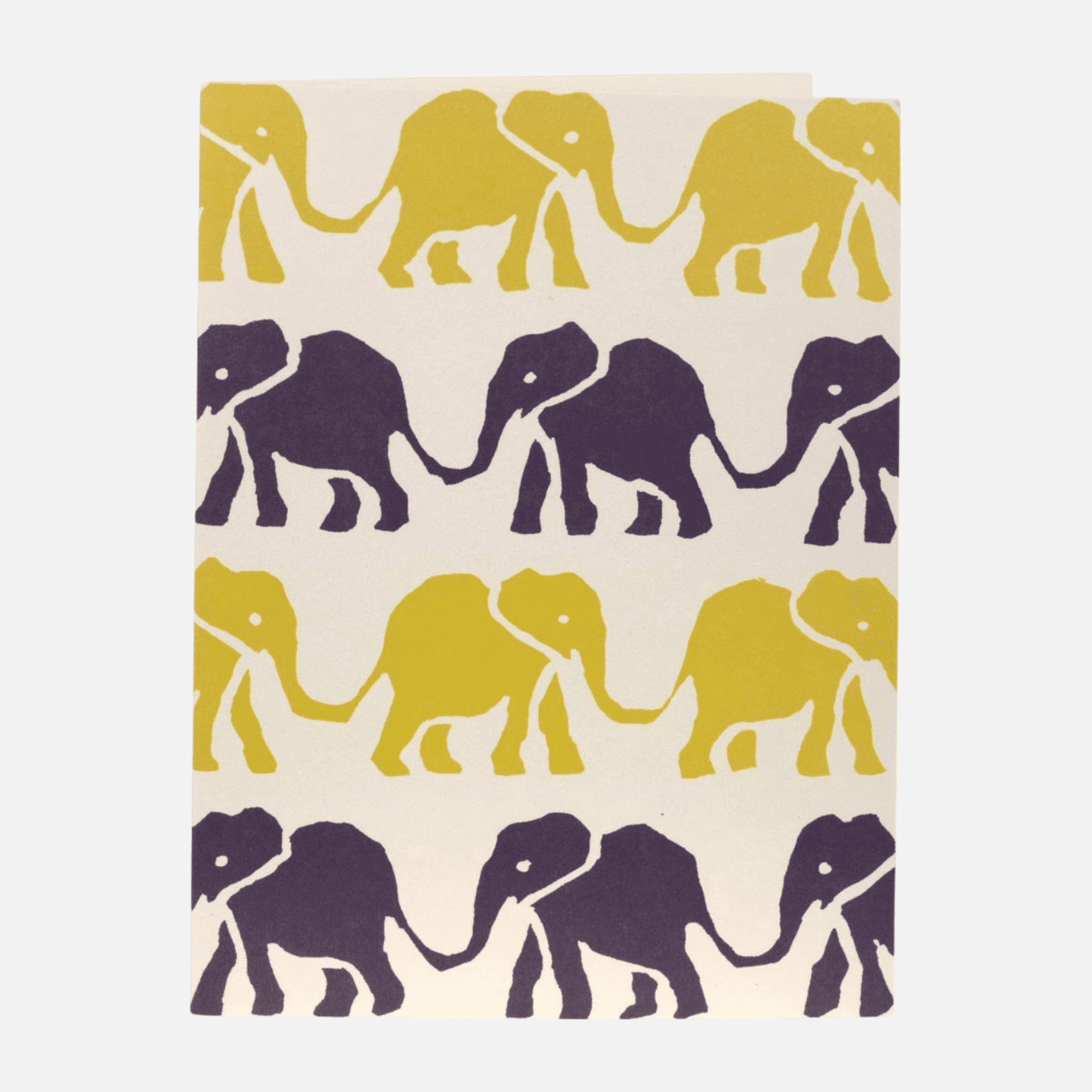 Bold, joyful and strikingly graphic, this elephant motif is a Cambridge Imprint classic. Printed in deep navy with a vibrant pop of acid yellow, it brings rhythm and movement to the page, a design that feels both playful and timeless. The card itself is beautifully made, using smooth ivory 300gsm stock and hand-mixed colours that give a richness and clarity you can see and feel.