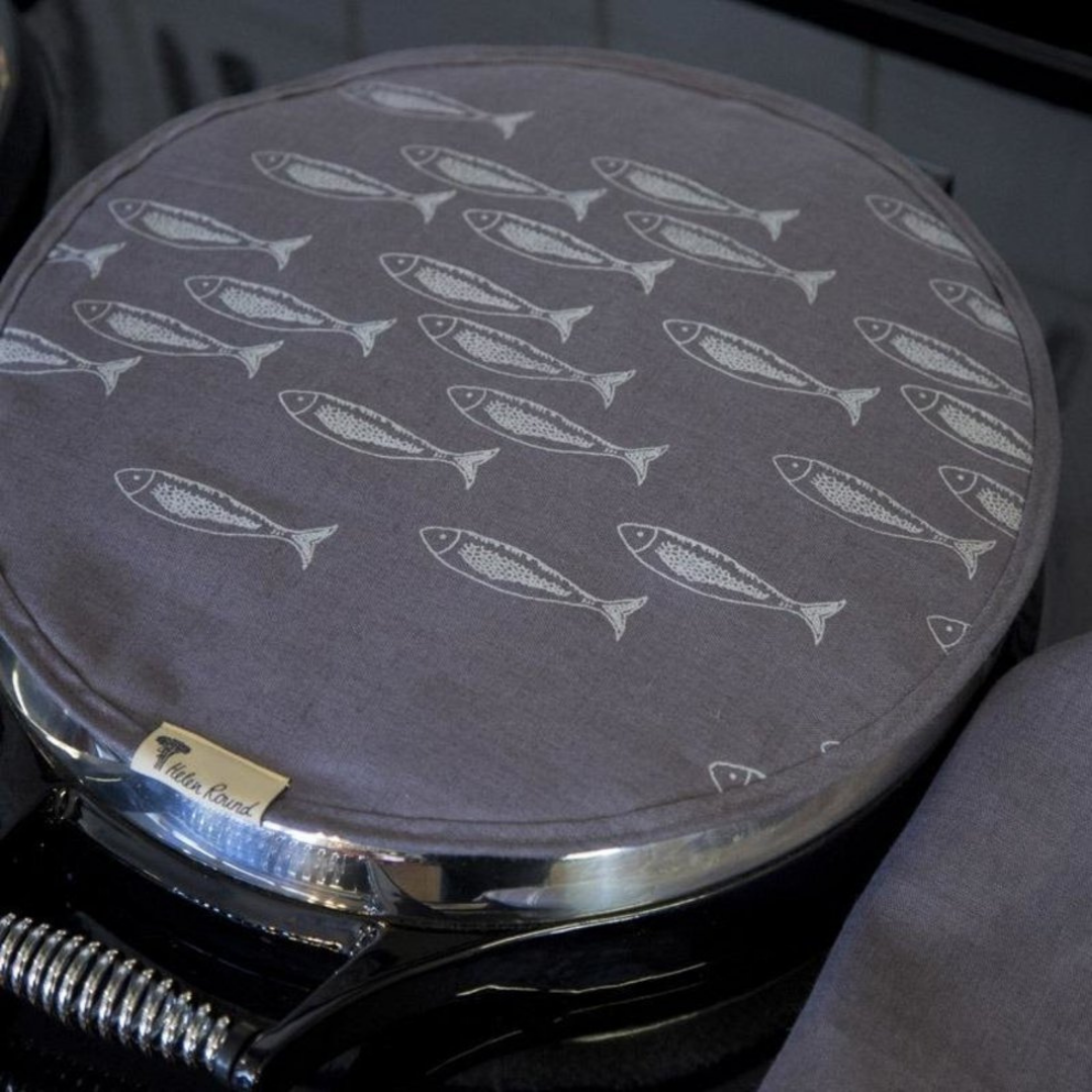 These Hob Covers feature a hand printed design from the Quayside Collection, inspired by Cornwall's fishing heritage. A silvery shoal of grey fish print on Cornish Slate Grey linen. Each is well padded and finished with a layer of towelling.