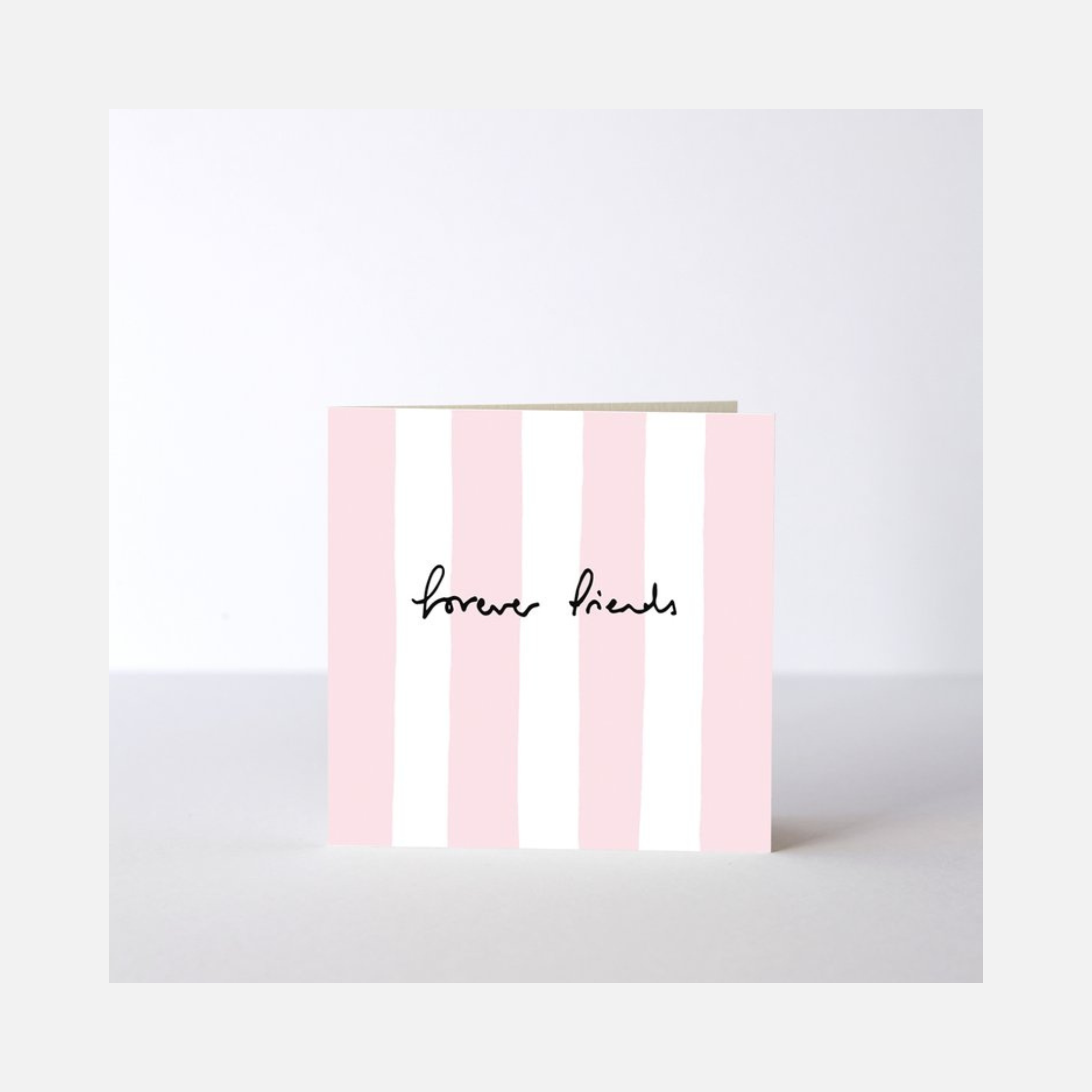 Celebrate a special bond with this charming Forever Friends card from Heather Evelyn. Featuring soft pink stripes and elegant black lettering, it’s a sweet and simple way to tell someone how much they mean to you.