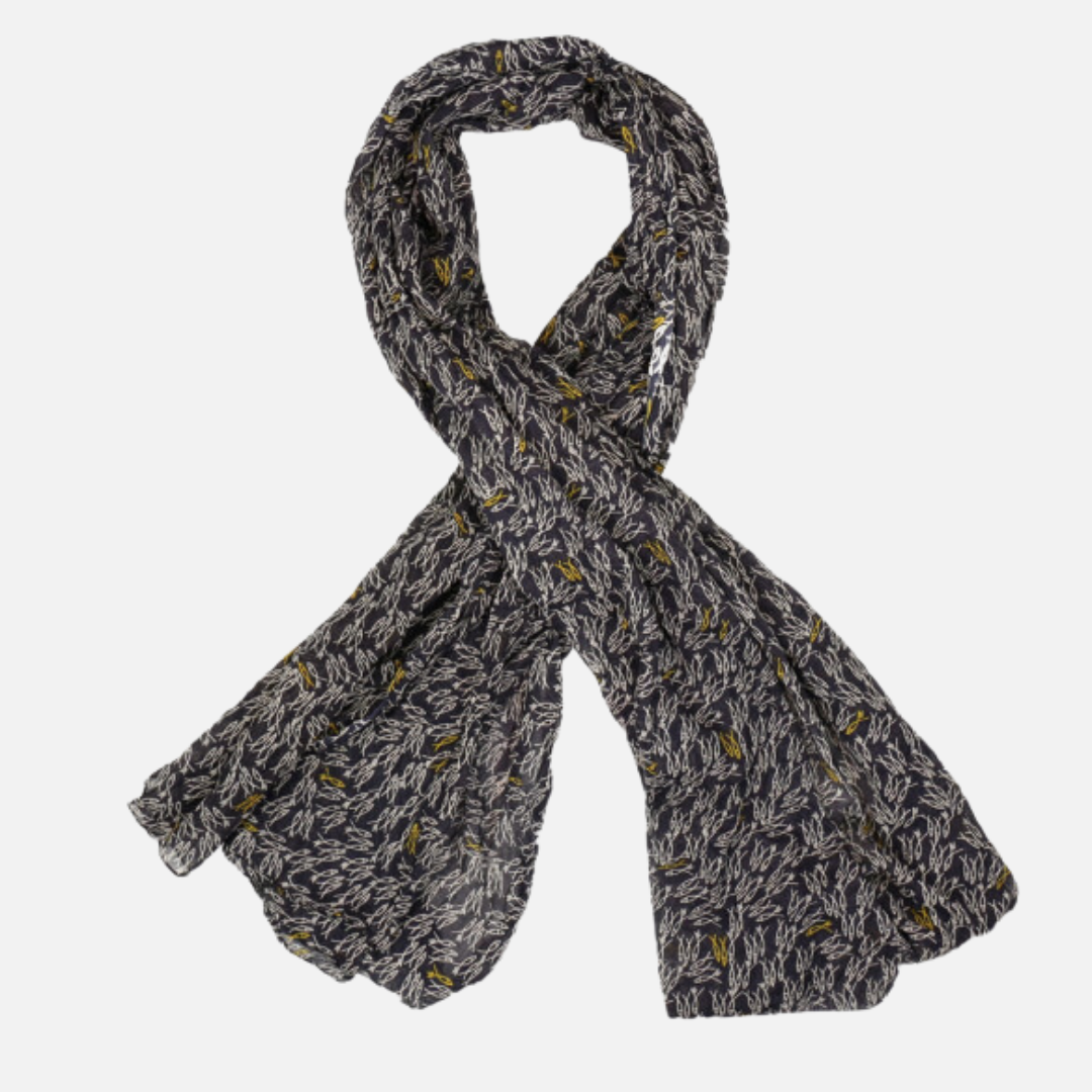 The Foulard-S Eperlans Marine is a light printed cotton scarf/pareo twisted in the navy colourway. It can be worn naturally or pleated.