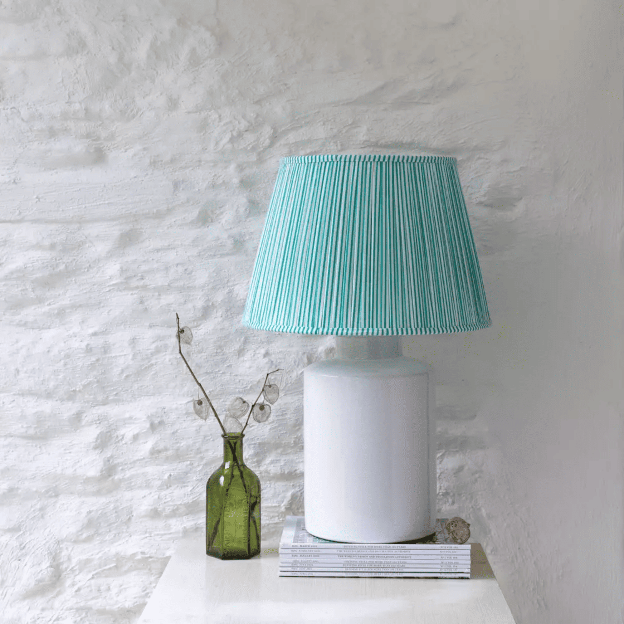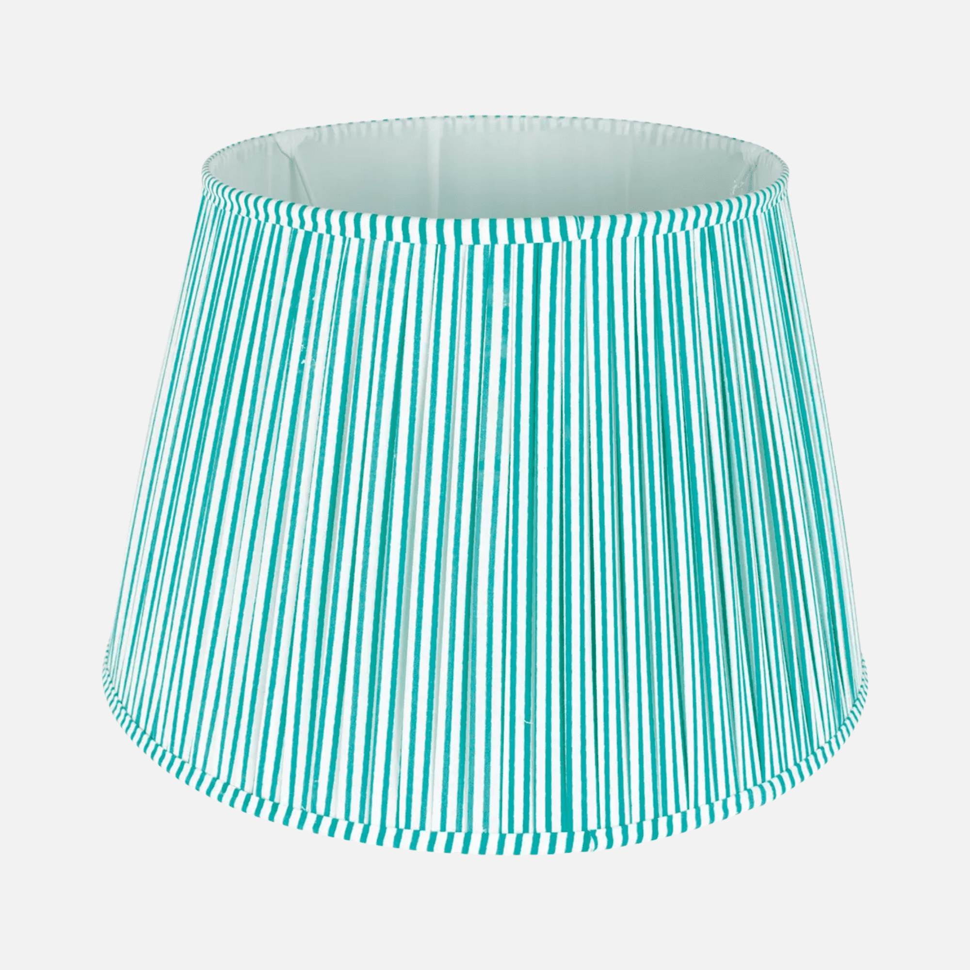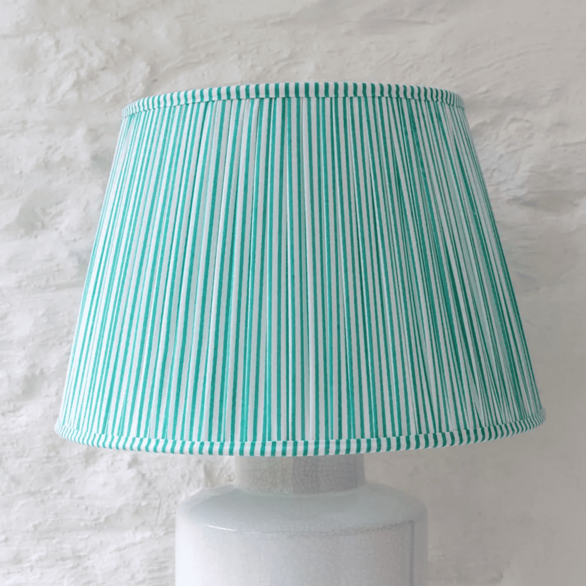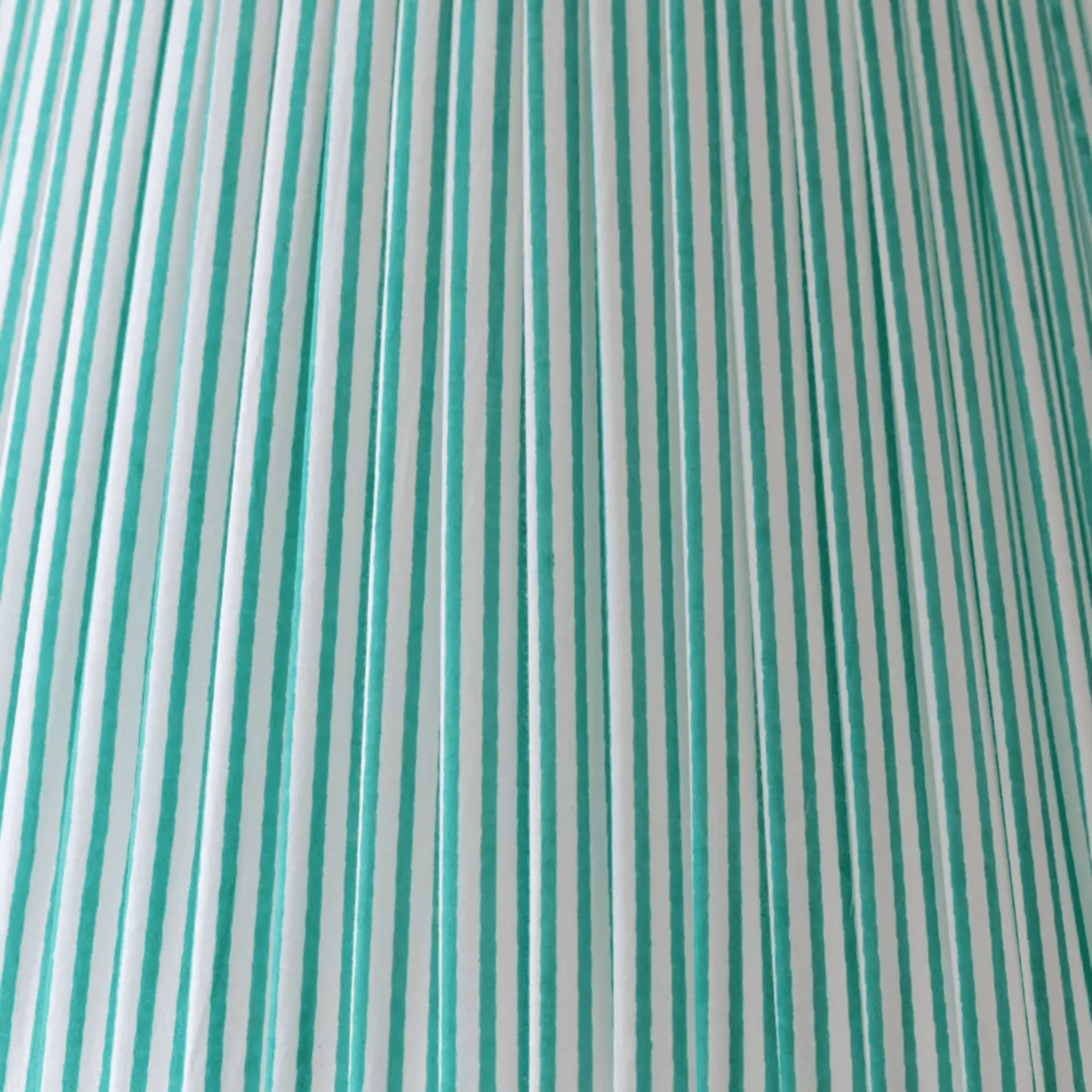 Bring a fresh pop of colour and timeless craftsmanship into your home with this stunning pleated lampshade in mint and white stripe. Hand block printed by artisans in India, each piece is individually crafted using traditional techniques that make every lampshade one of a kind.