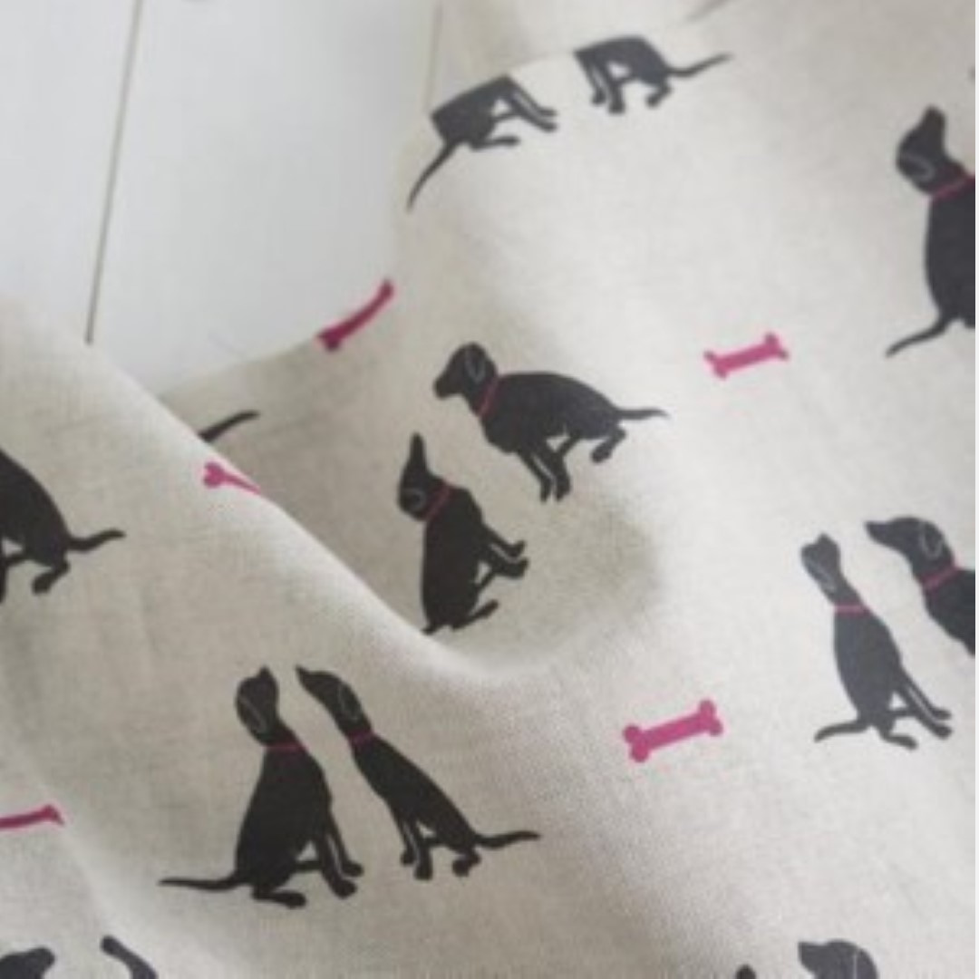 The Jemma design from Olive & Daisy was inspired by a gorgeous labrador puppy of the same name. This design features two adoring puppies wearing matching collars with a cute little bone in between repeats. This print is available in 4 colourways.