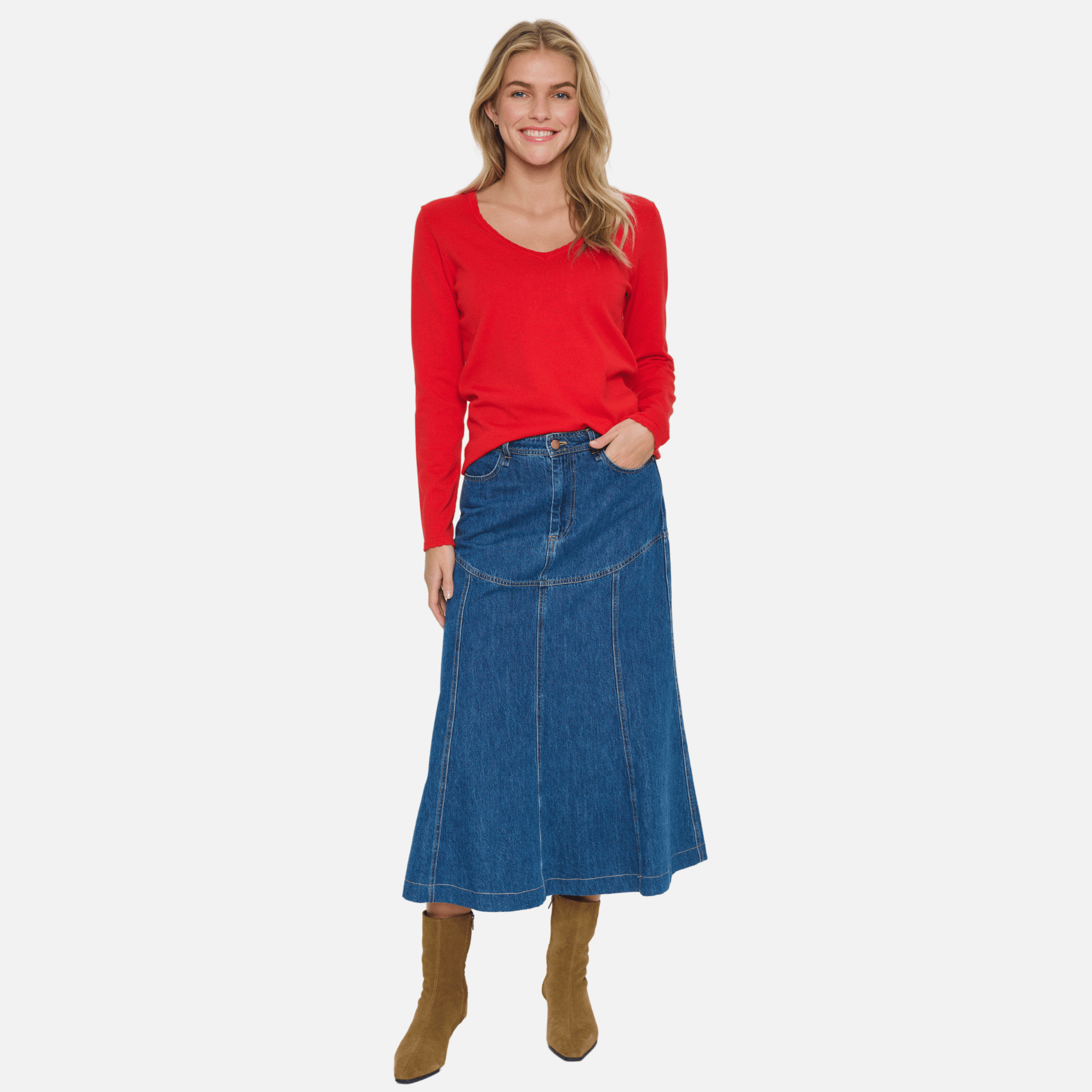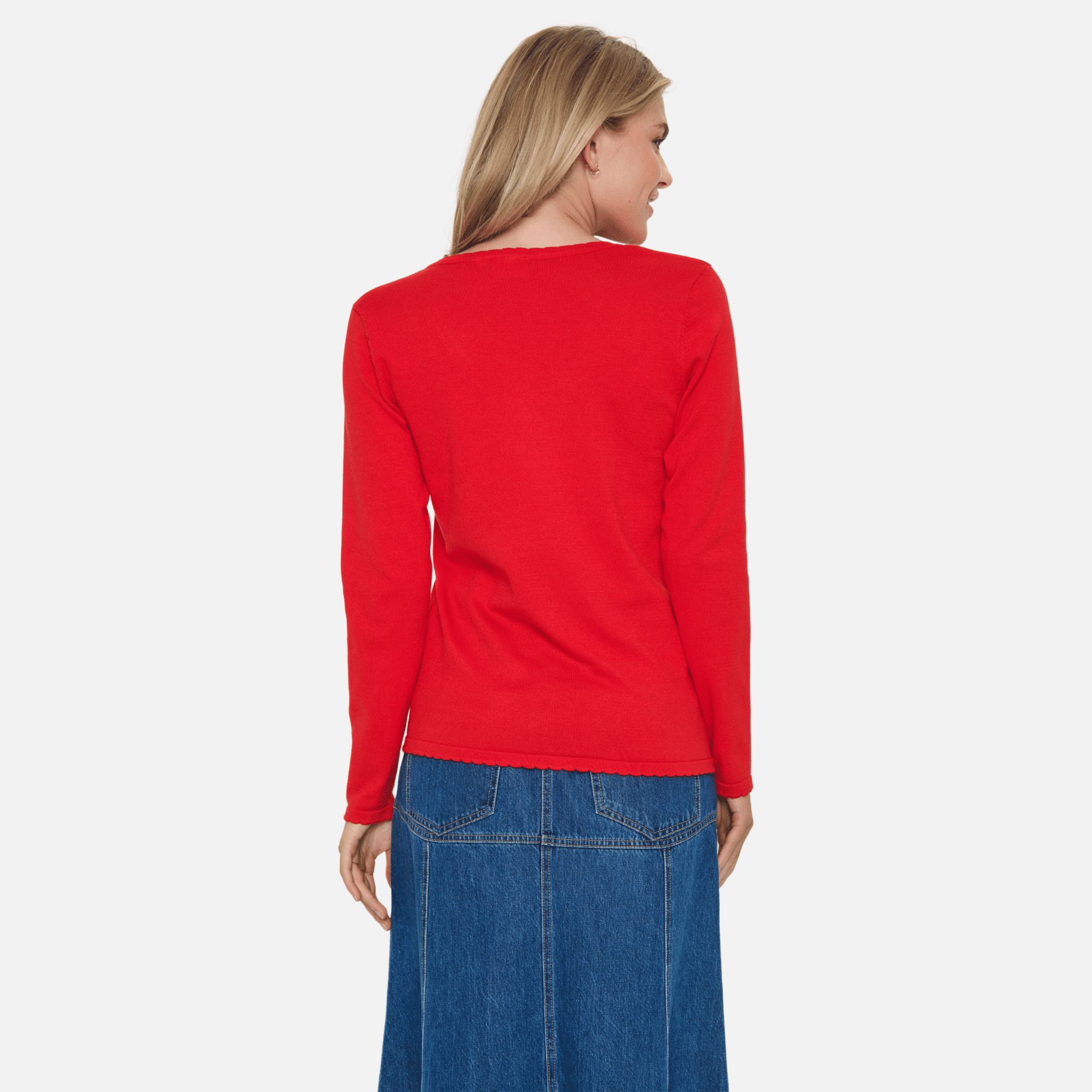 The Mila V-Neck Pullover in Flame Scarlet by Saint Tropez is a beautifully feminine and effortlessly chic wardrobe staple. Designed with a v-neckline and delicate scalloped edging, this lightweight knit offers a graceful, polished look while ensuring all-day comfort. Whether paired with tailored pieces or dressed down with denim, it’s a versatile essential you'll reach for time and time again.
