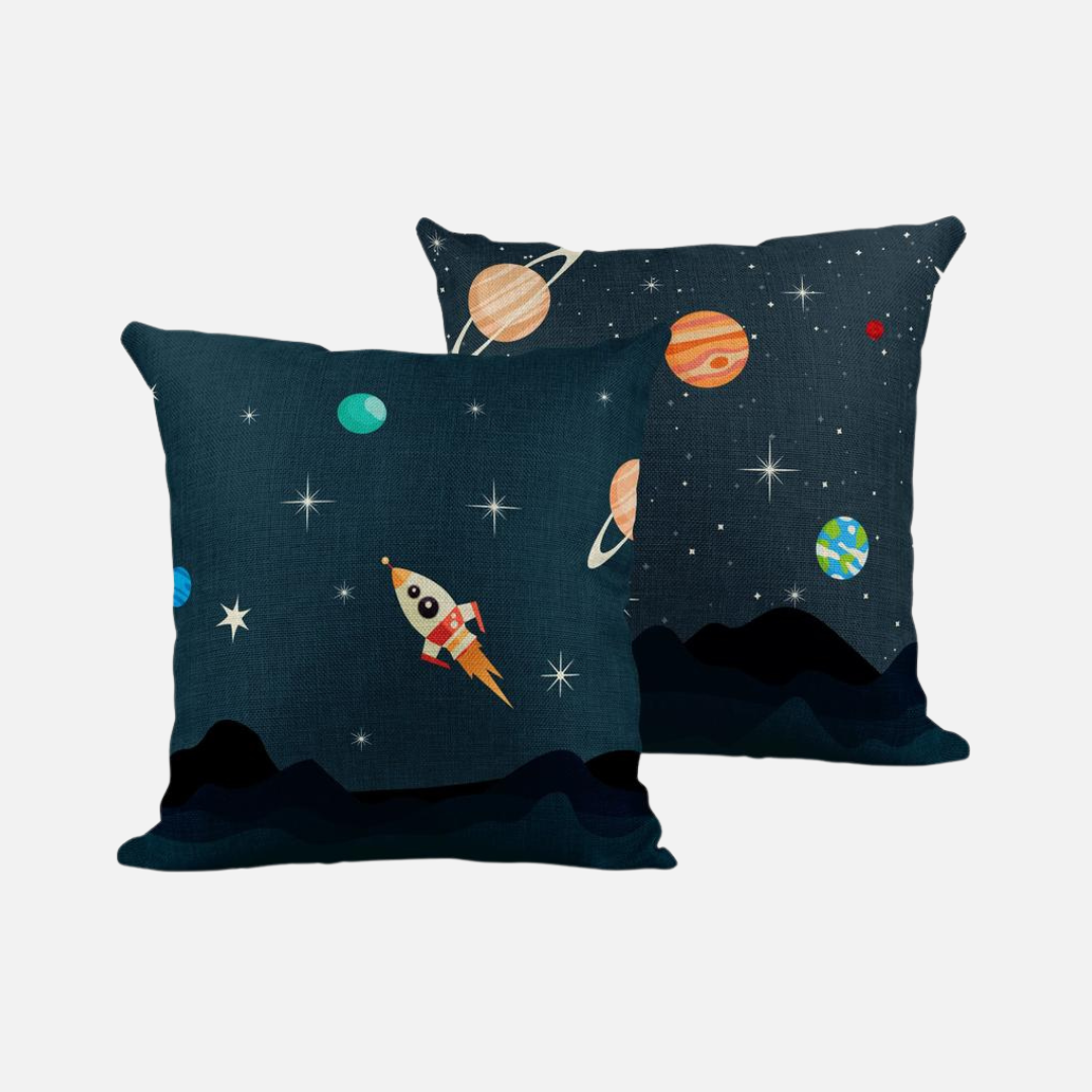 A colourful cushion from Mustard & Gray adorned with a lunar landscape filled with the planets, twinkling stars and of course a space rocket! The ideal choice for space gazers. This lovely cushion will engage your youngster and add a cosy atmosphere to their room.