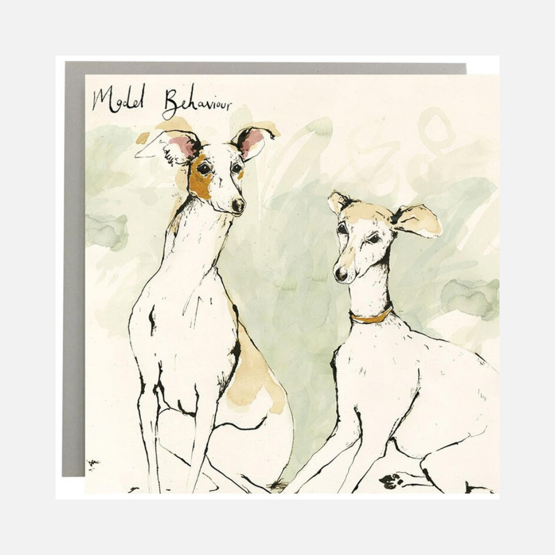 For the dog lover with a sense of humour, this ‘Model Behaviour’ greetings card by Anna Wright features two impeccably behaved Whippets.