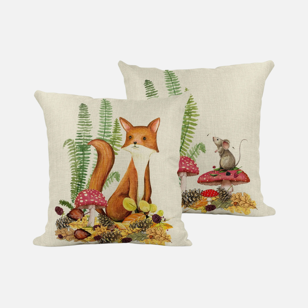 A colourful cushion from Mustard & Gray featuring a woodland floor bursting with life; a fox, squirrel, owl and mouse sitting amongst leafy ferns and colourful toadstools. The ideal choice for nature lovers. this lovely cushion will engage your youngster and add a cosy atmosphere to their room.