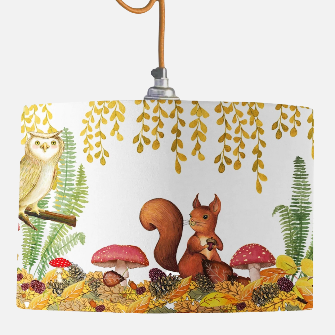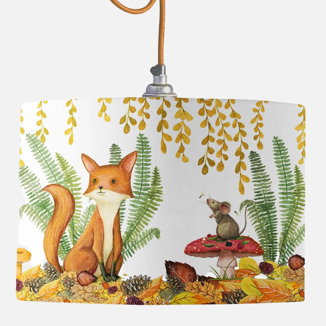 A colourful shade featuring a woodland floor bursting with life; a fox, squirrel, owl and mouse sitting amongst leafy ferns and colourful toadstools. The ideal choice for nature lovers. This lovely lampshade will engage your youngster and add a cosy atmosphere to their room.