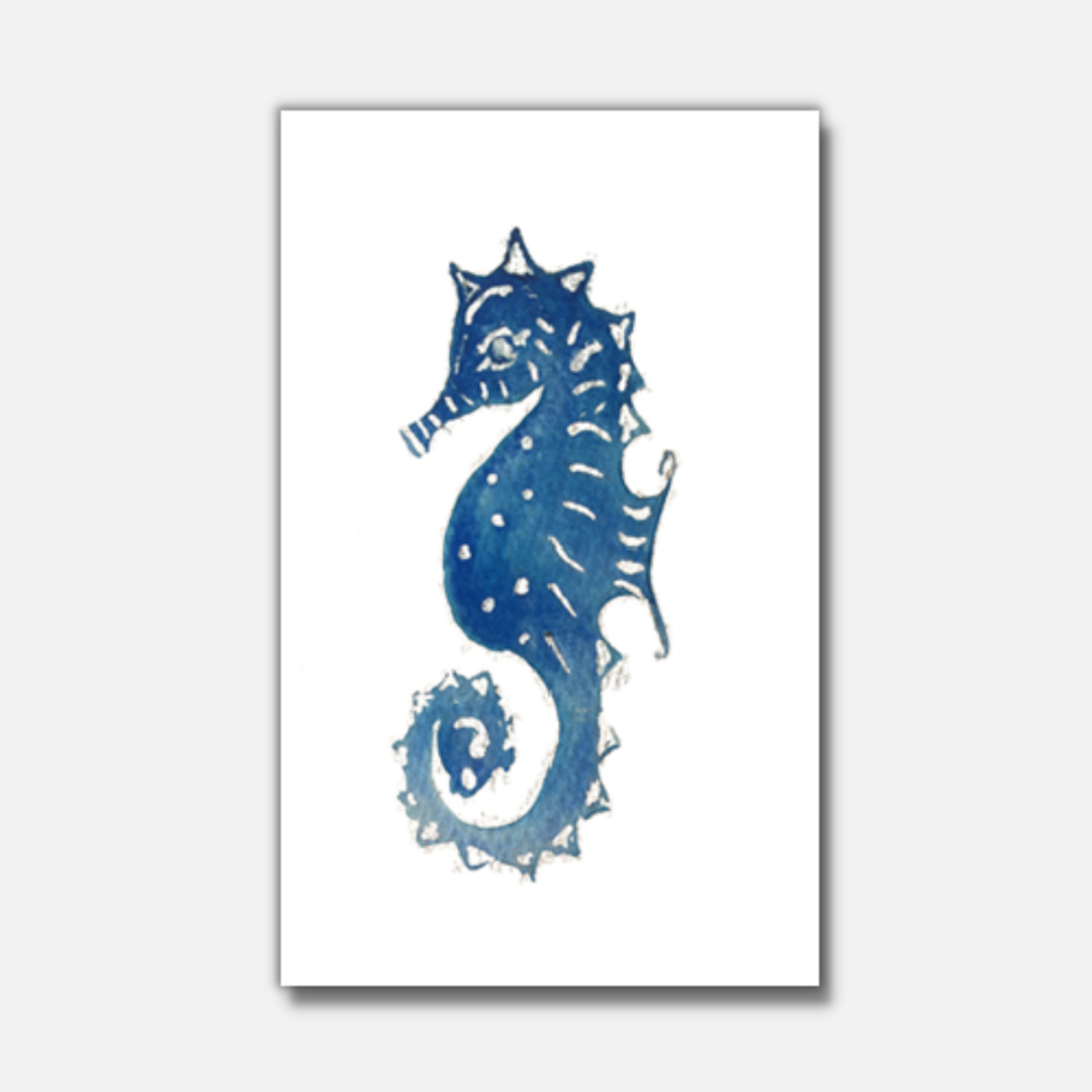 This signed watercolour print from Oyster Moon features the fascinating Seahorse in blue, grey and white. With a head and neck suggestive of a horse, seahorses also feature segmented bony armour, an upright posture and a curled prehensile tail.