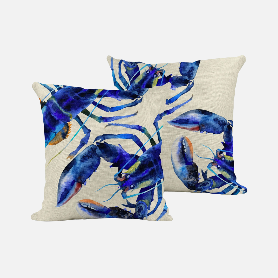 A striking cushion from Mustard & Gray featuring their pinchy lobster design, vibrant blues and greens set on a neutral background. Anyone who loves sea life will love this design. This lovely cushion works really well for kitchens, coastal homes and interiors.