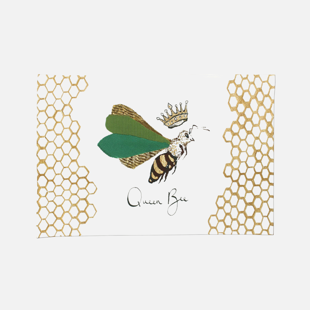 A crisp and classic tea towel from Anna Wright illustrated with a regal, crown wearing Queen Bee and the handwritten text ‘Queen Bee’.