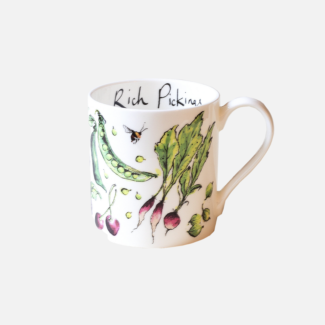 A lovely mug from Anna Wright illustrated with tasty fruits and vegetables on the outside, the handwritten text ‘Rich Pickings’ on the inside of the lip and two strawberries inside on the base, so there’s a wee surprise when you finish your cup of tea…